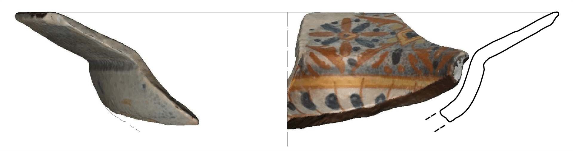 Ulomak oboda posude otvorene forme. Oker narančasta, dobro pročišćena glina. Iznutra su vegetabilni motivi slikani smeđom, zelenom, plavom i žutom bojom na sivoplavoj podlozi. Glazura iznutra i izvana. Majolika.