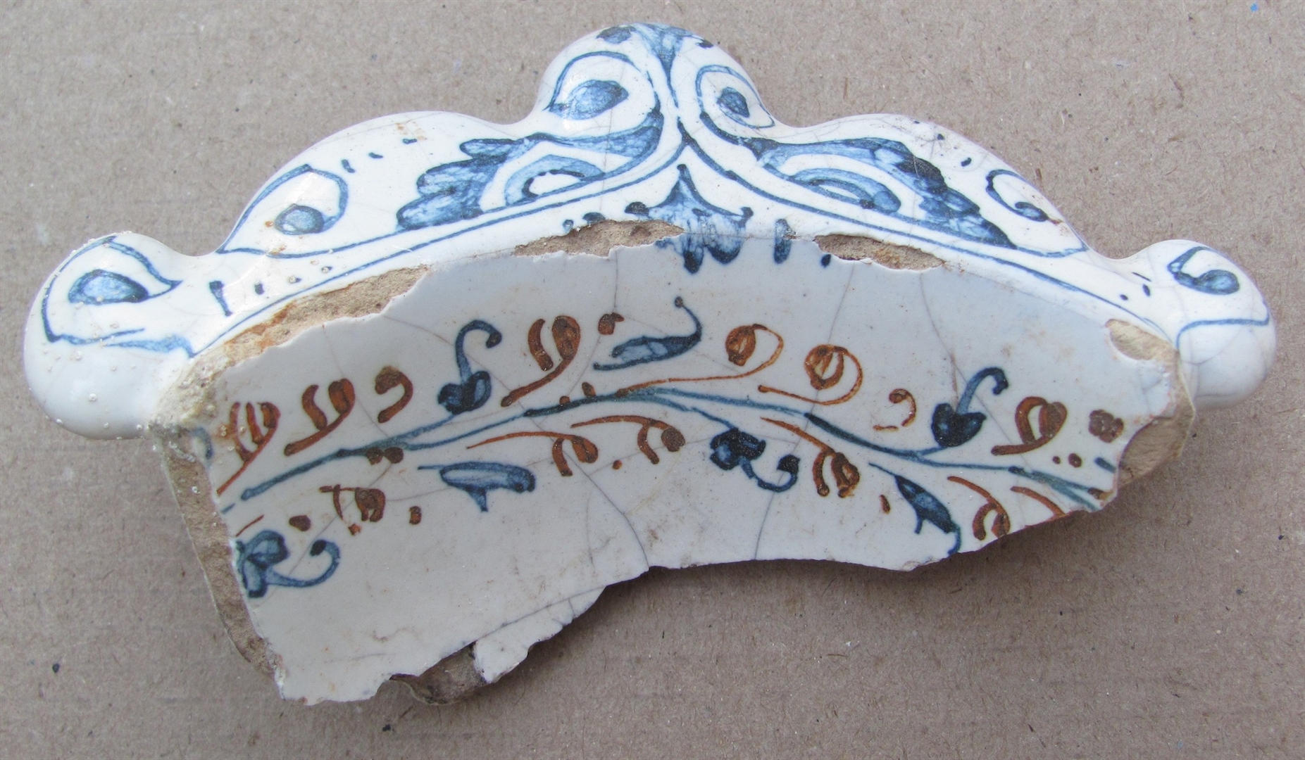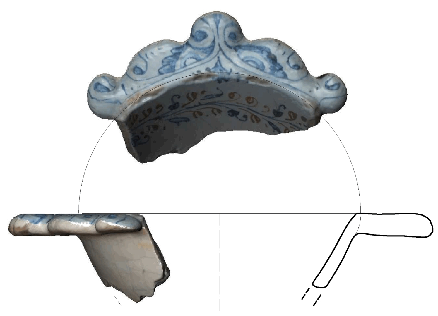 Ulomak oboda posude i vodoravno postavljene ručkice u obliku palmete. Oker narančasta, dobro pročišćena glina. Iznutra su vegetabilni motivi slikani oker, smeđom i plavom bojom. Glazura iznutra i izvana. Majolika.