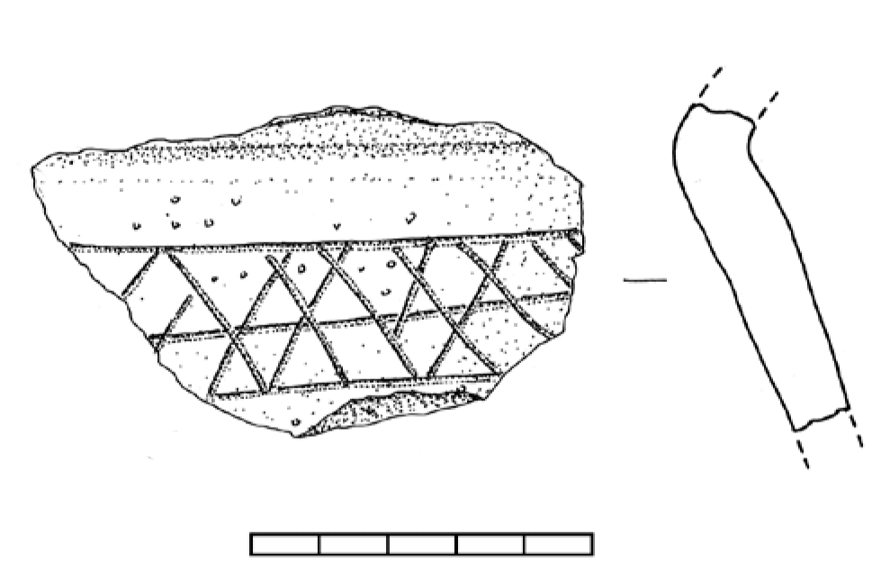 Ulomak trbuha posude grube izrade s puno primjesa kalcita, izvana i u prijelomu crne, a iznutra crvene boje.