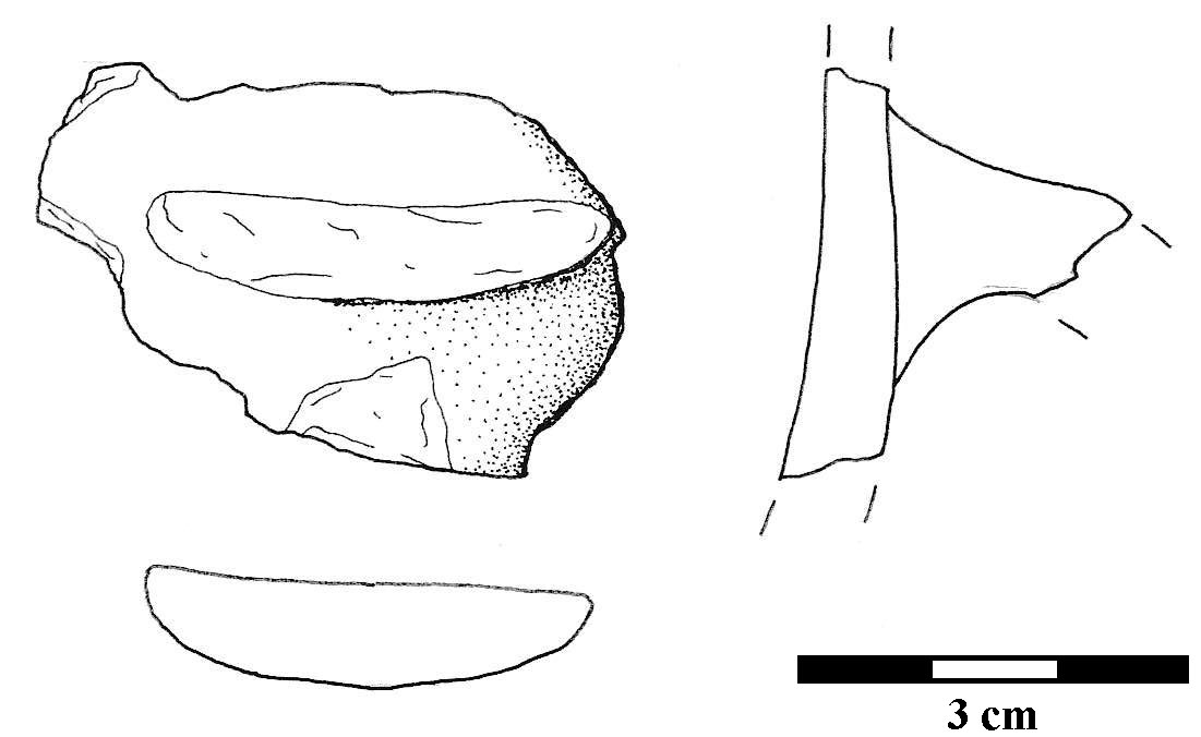 Ulomak tijela posude s bazom odlomljene trokutaste ručke. Keramika je sive boje, grube fakture s primjesama kalcita.