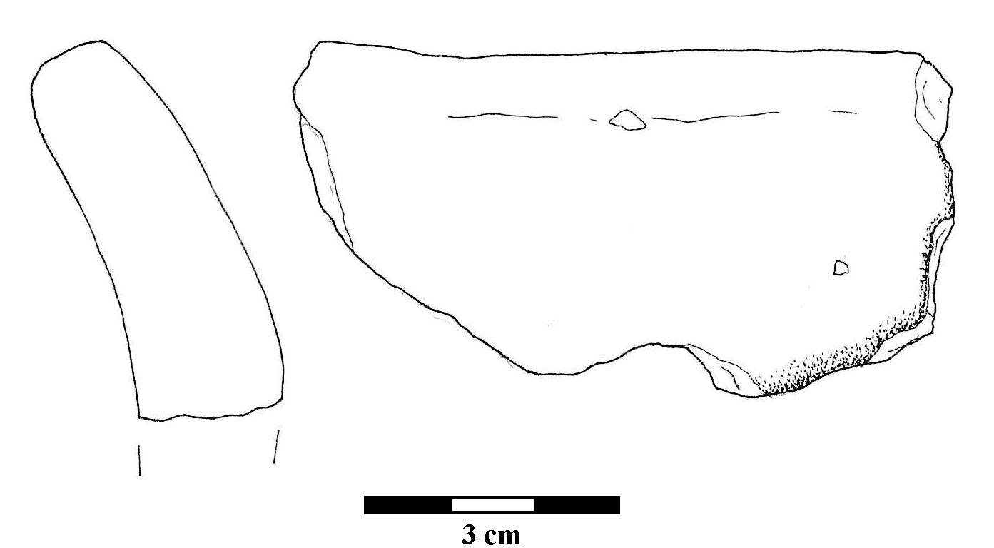 Ulomak prema vani izvijenog ušća posude.Keramika je crvene boje, a presjek sive sa primjesama krupnog kalcita.