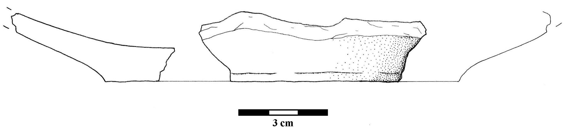 Ulomak posude ravnog dna s djelom trbuha. Keramika je narančasto crne boje i poliranih površina.