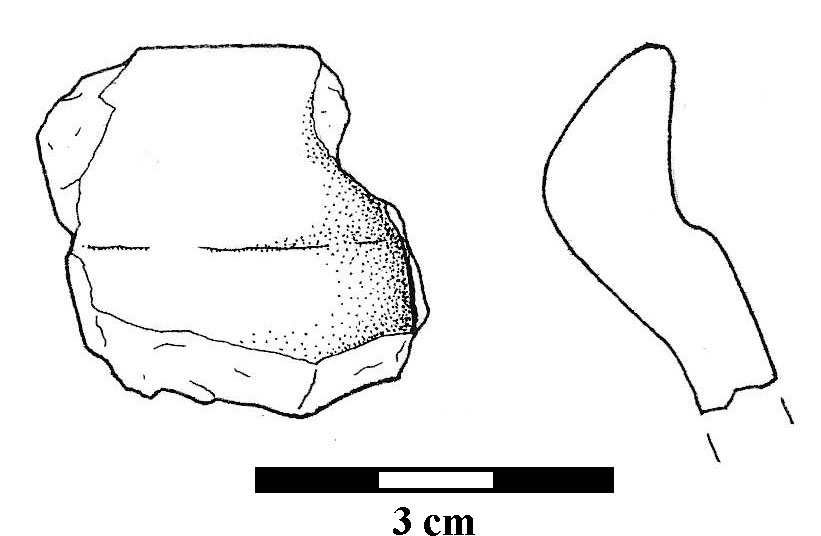 Ulomak prema unutra zakošenog ušća posude ispod kojeg se nalazi naglašen vrat. Keramika je narančasto sive boje.