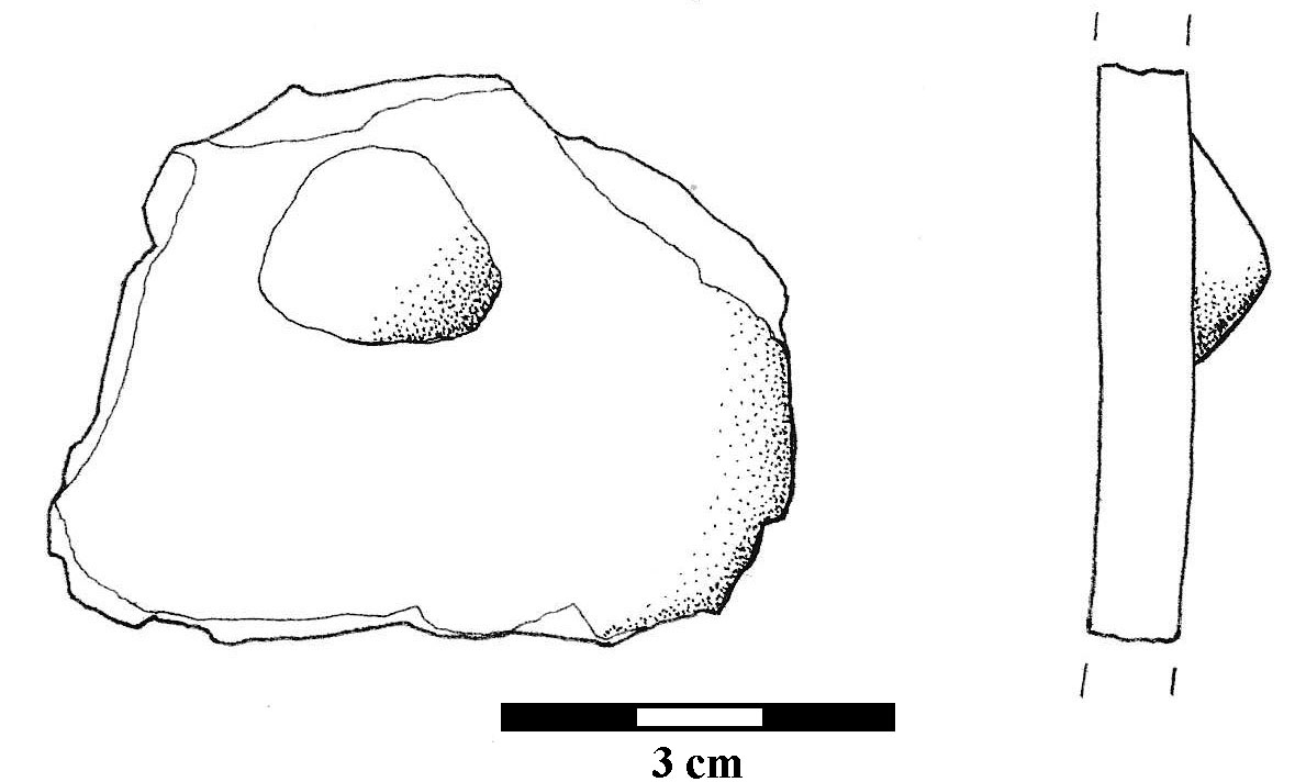 Ulomak tijela posude na kojem se nalazi plastična aplikacija u obliku bradavice. Keramika je sivo narančaste boje grube fakture.