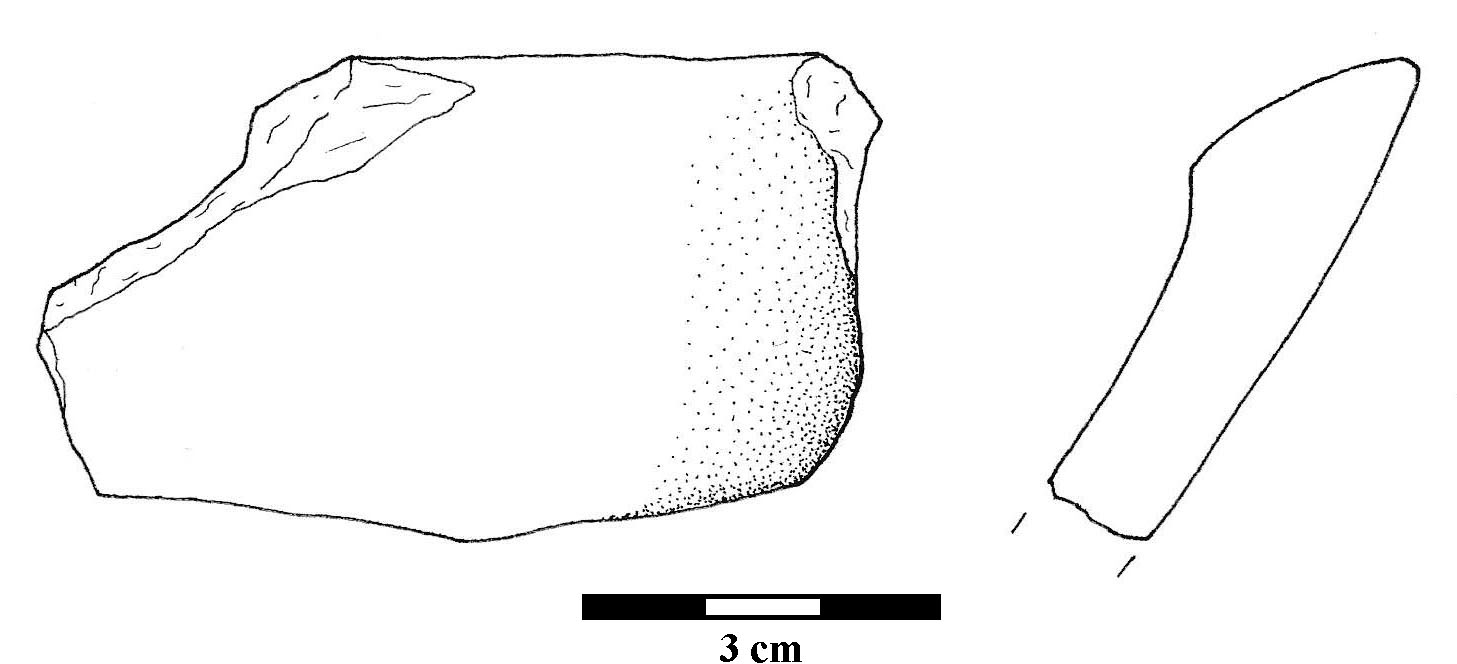 Ulomak gornjeg djela posude s ušćem zakošenim prema unutra. Keramika je oker sive boje finije fakture.