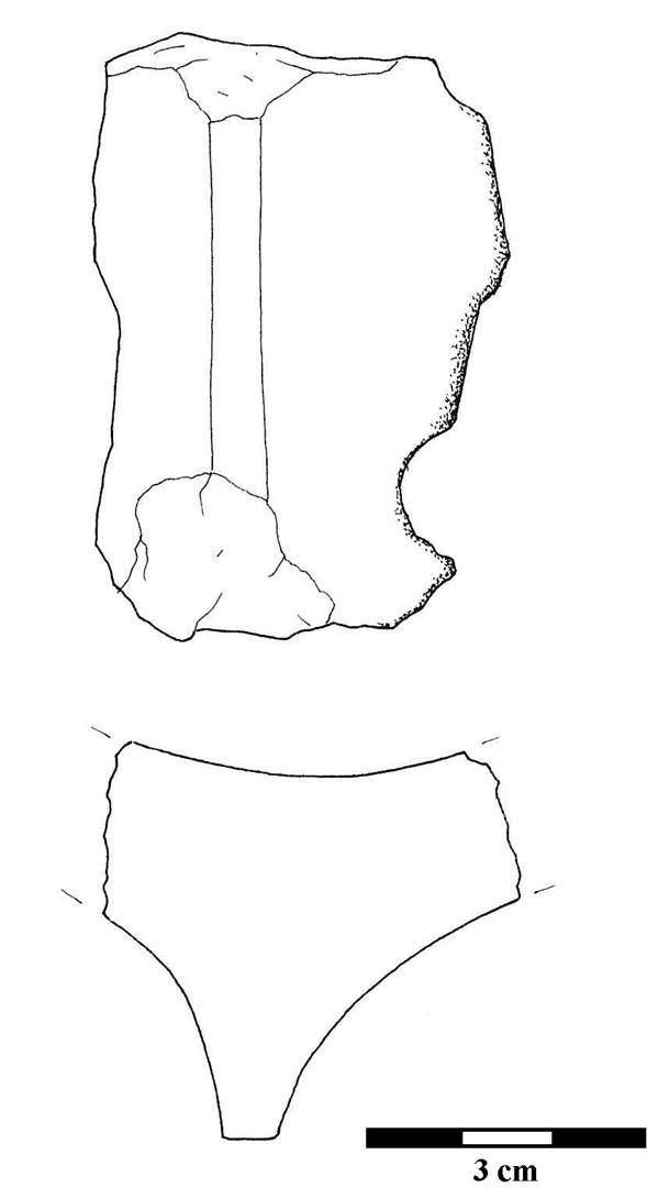 Ulomak ruba posude na kojoj se uočava dio rupe. Keramika je sivo oker boje.