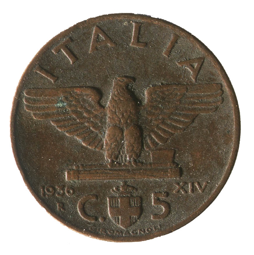 Avers: Centralni dio kovanice zauzima profil osobe sa pogledom u desno. Sa njegove lijeve strane nalazi se djelomično izlizan natpis VITT. EM., a sa njegove desne strane natpis III.RE.E.IMP. Revers: Orao raširenih krila koji u kanđama drži fascio, iznad kojeg je natpis ITALIA. Ispod fascia, sa desne strane, nalazi se godina 1936. a ispod nje veliko slovoR. Sa desne strane rimski broj XIV. Na dnu se nalazi grb, a ispod njega natpis O. ROMAGNOLI. Sa lijeve strane grba nalazi se slovo C. , a sa desne strane broj 5.