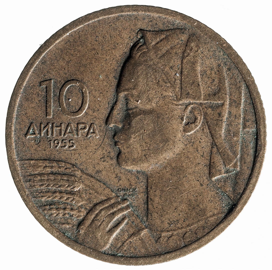 Avers: U sredini državni grb. U gornjem djelu uz rub polukružno napisan tekst FEDERATIVNA NARODNA REPUBLIKA JUGOSLAVIJA. Revers: Prikaz seljanke koja drži žito u profilu.Uz rub broj 10 (nominala), a ispod njega tekst DINARA na ćirilici i godina 1955.