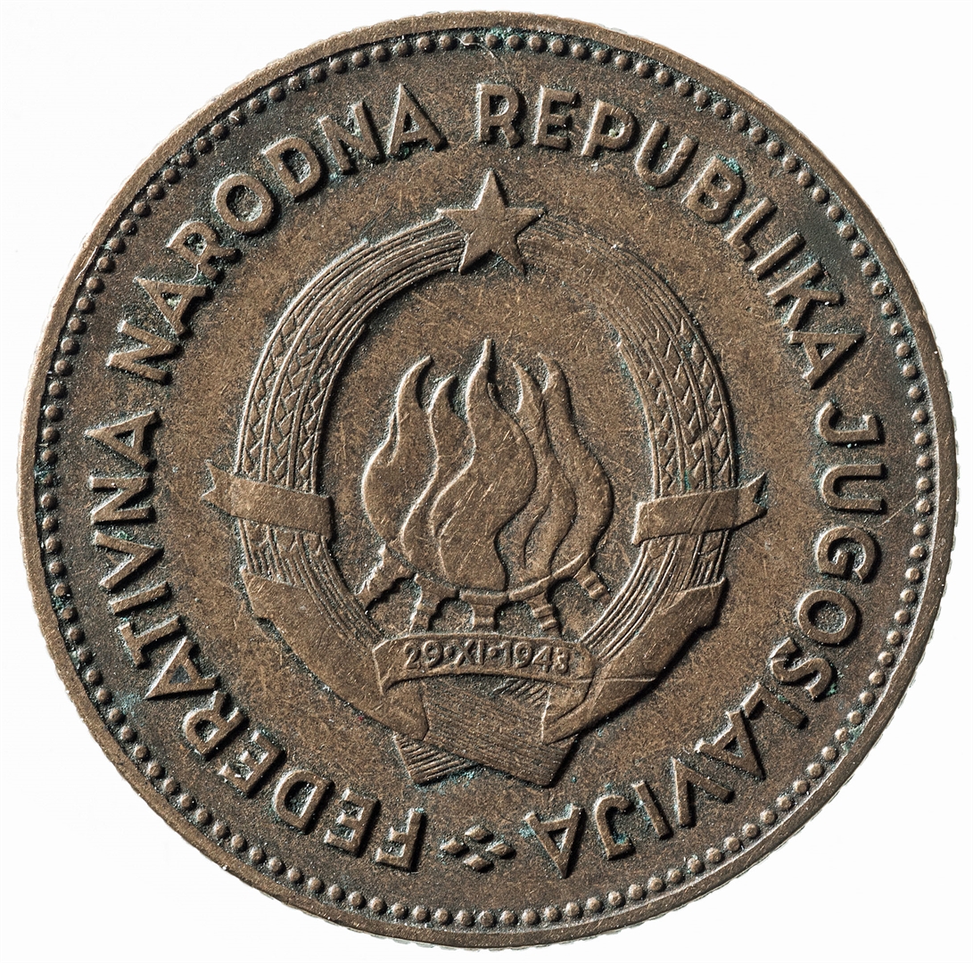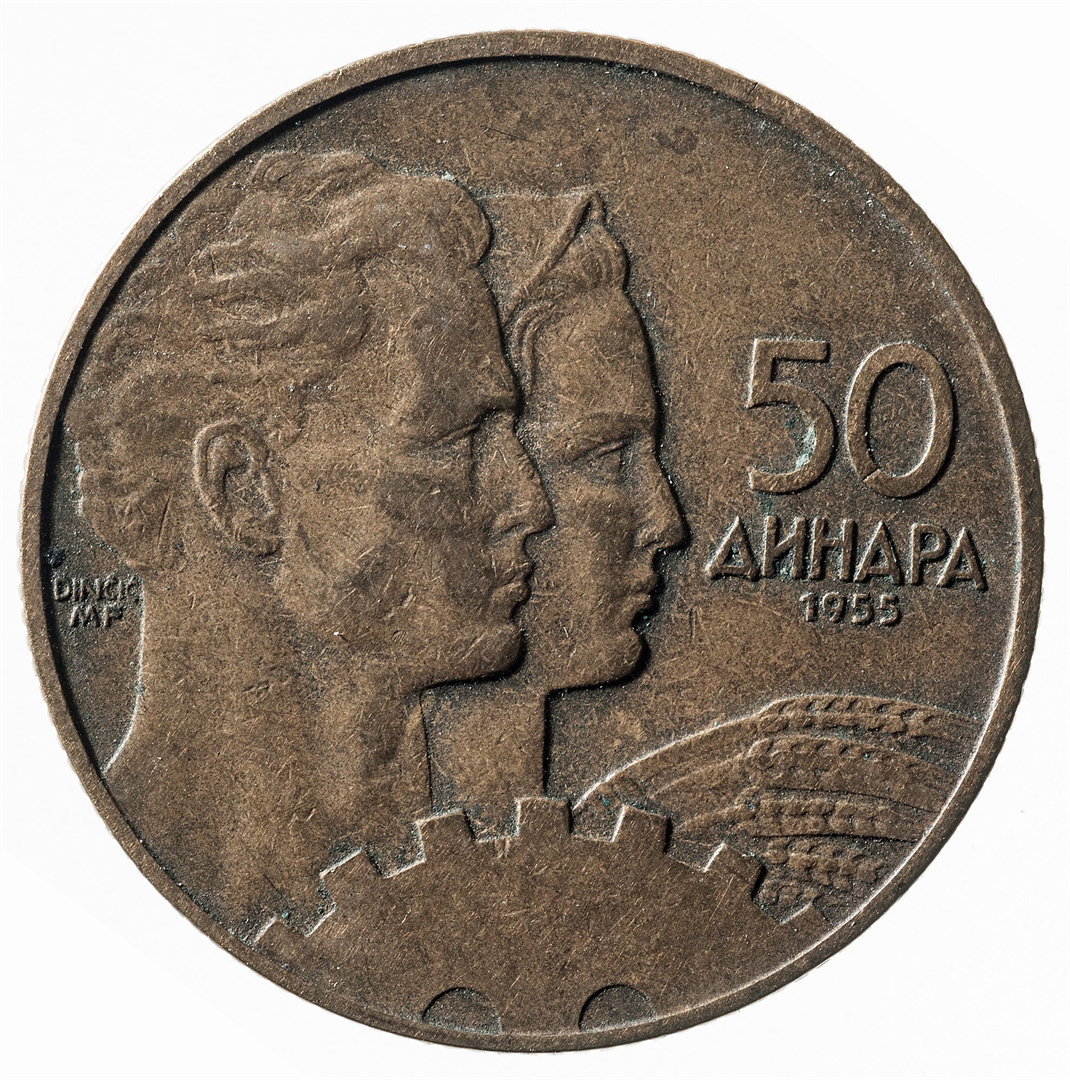 Avers: U sredini državni grb. U gornjem djelu uz rub polukružno napisan tekst FEDERATIVNA NARODNA REPUBLIKA JUGOSLAVIJA. Revers: Prikaz seljanke koja drži žito i radnika uz stroj u profilu.Uz rub broj 50 (nominala), a ispod njega tekst DINARA na ćirilici i godina 1955.
