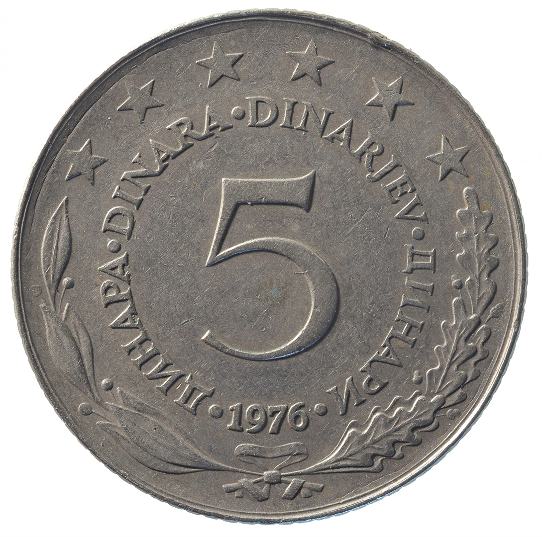 U sredini broj 5 (nominala), oko njega tekst DINAR na četiri jezika, a ispod toga godina 1976. Duž gornjeg ruba polukružno poredano 6 petokrakih zvjezdi.