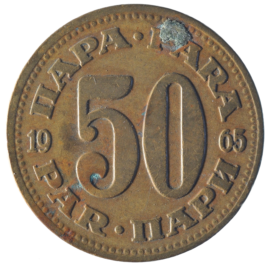 U sredini broj 50 (nominala), a oko njega tekst PARA na četiri jezika. U sredini uz lijevi i desni rub upisana godina 1965.