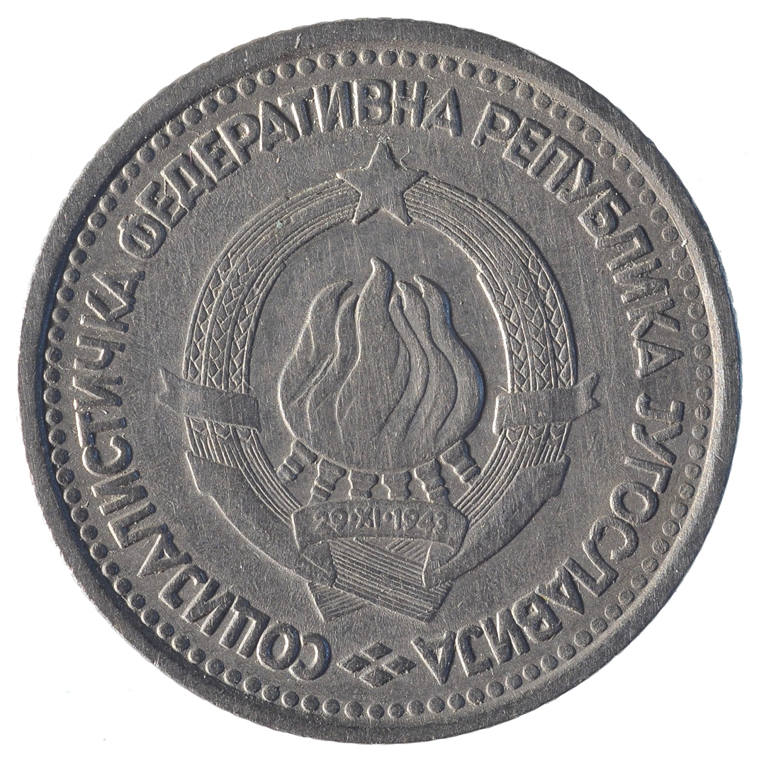 U sredini broj 1 (nominala), a ispod njega tekst DINARA i godina 1965. Duž cijelog gornjeg ruba polukružno poredano 6 petokrakih zvjezdi.
