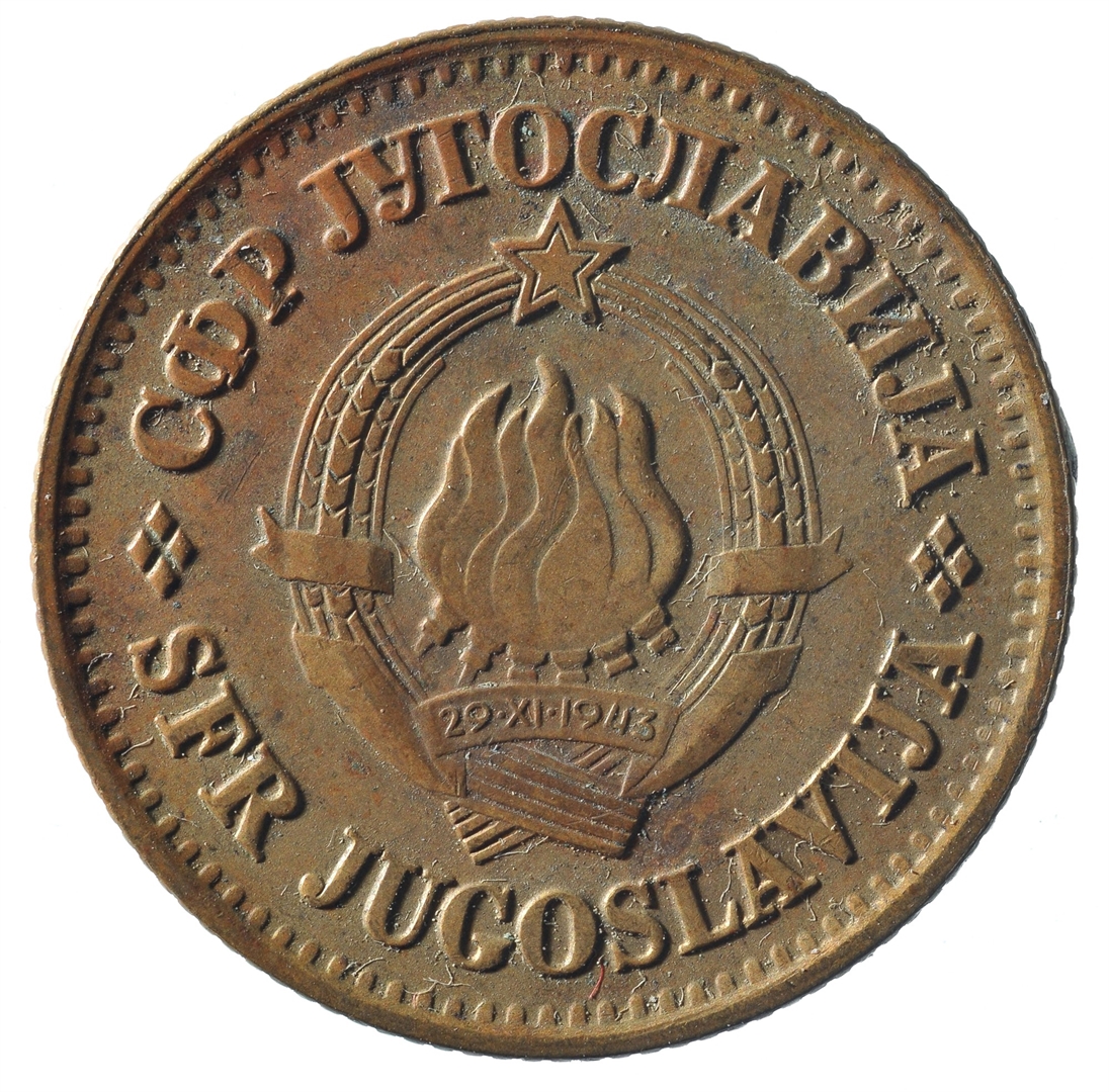 U sredini državni grb. U gornjem djelu uz rub polukružno napisan tekst SFR JUGOSLAVIJA na latinici i ćirilici.