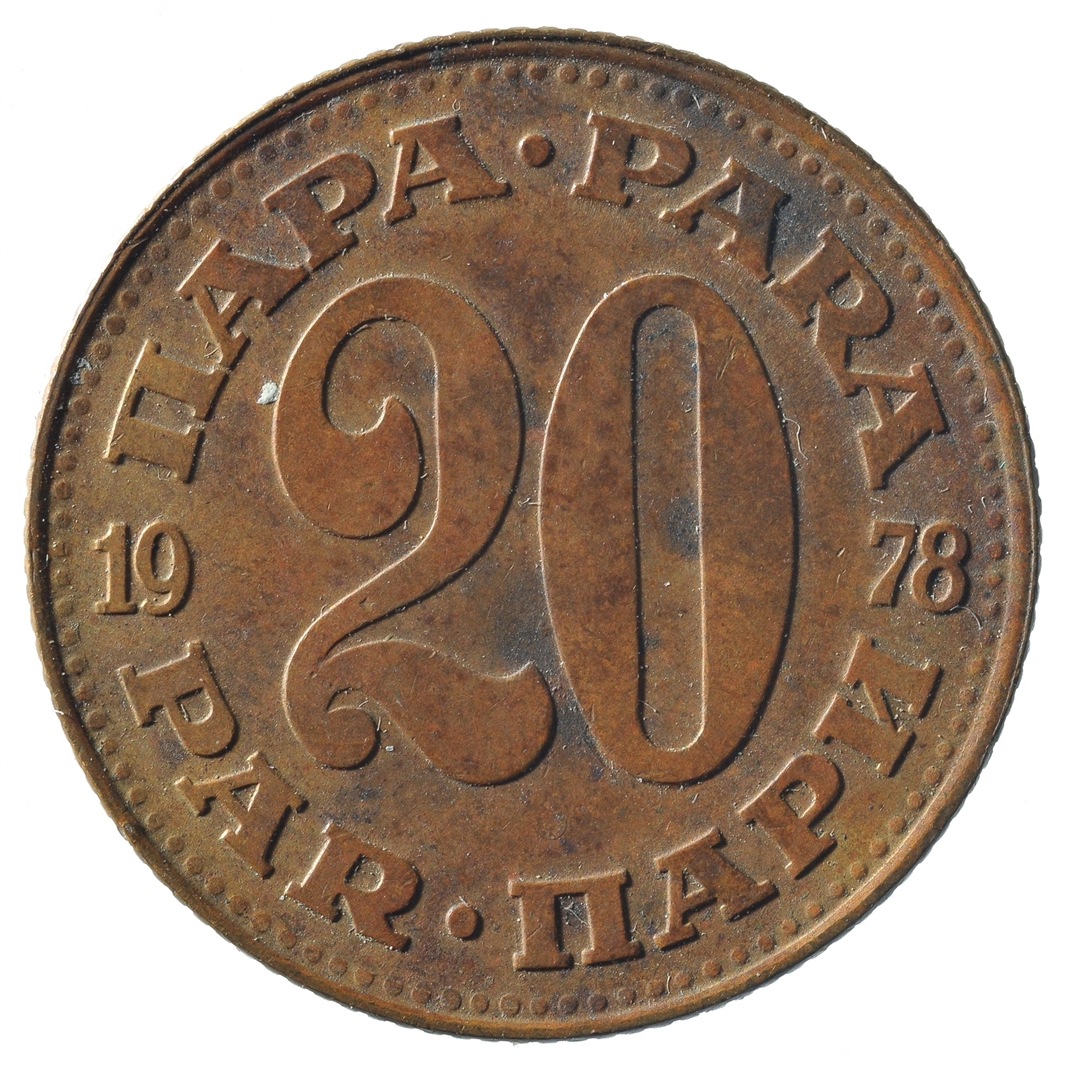 U sredini broj 20 (nominala), a oko njega tekst PARA na četiri jezika. U sredini uz lijevi i desni rub upisana godina 1978.