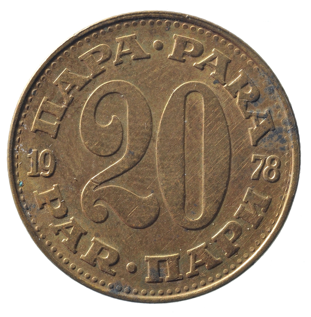 Avers: U sredini državni grb. U gornjem djelu uz rub polukružno napisan tekst SFR JUGOSLAVIJA na latinici i ćirilici. Revers: U sredini broj 20 (nominala), a oko njega tekst PARA na četiri jezika. U sredini uz lijevi i desni rub upisana godina 1978.