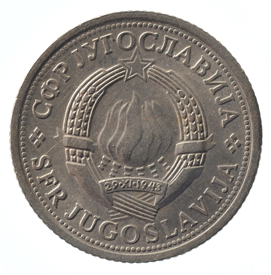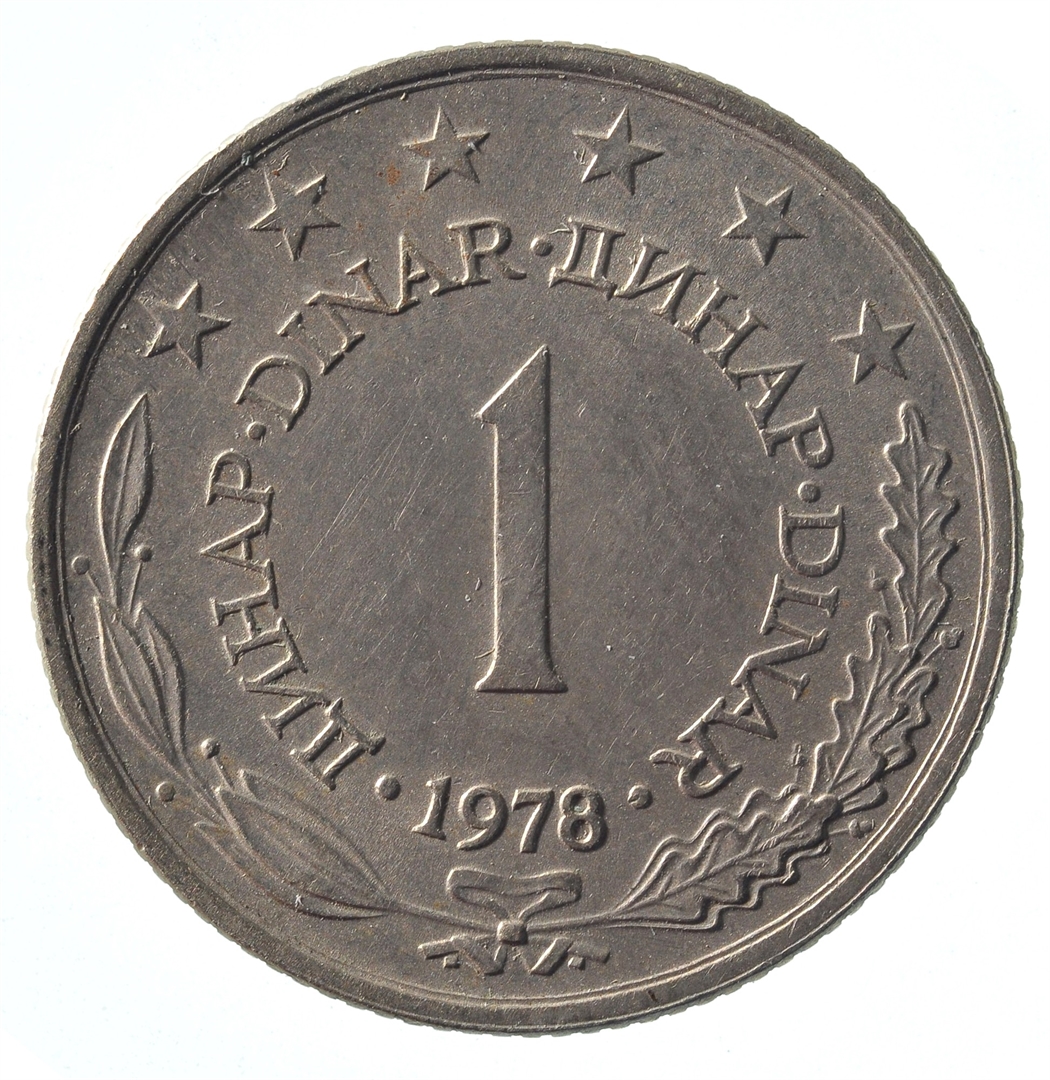 Avers: U sredini državni grb. U gornjem djelu uz rub polukružno napisan tekst SFR JUGOSLAVIJA na latinici i ćirilici. Revers: U sredini broj 1 (nominala), oko njega tekst DINAR na četiri jezika, a ispod toga godina 1978. Duž gornjeg ruba polukružno poredano 6 petokrakih zvjezdi.