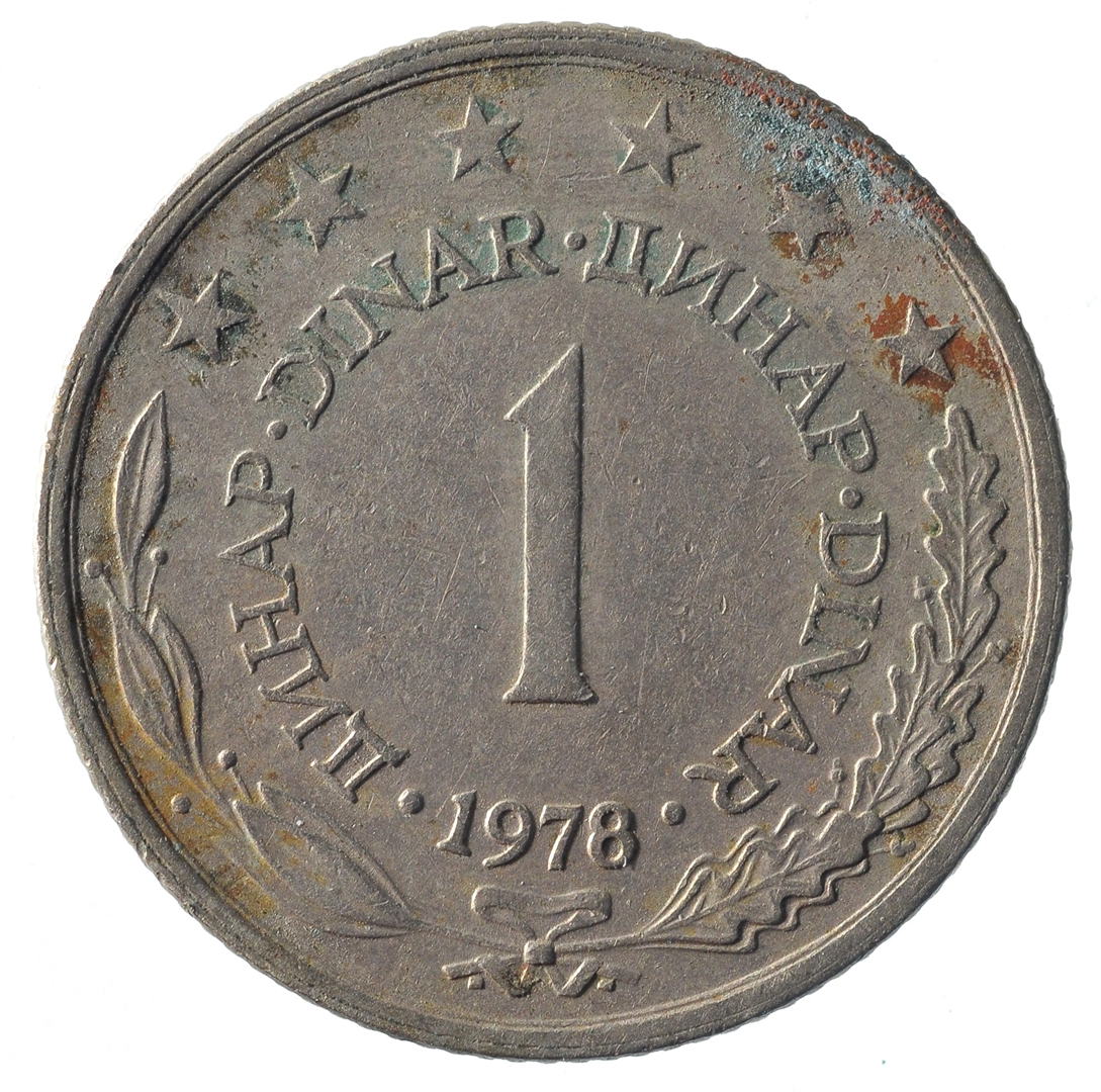 U sredini broj 1 (nominala), oko njega tekst DINAR na četiri jezika, a ispod toga godina 1978. Duž gornjeg ruba polukružno poredano 6 petokrakih zvjezdi.