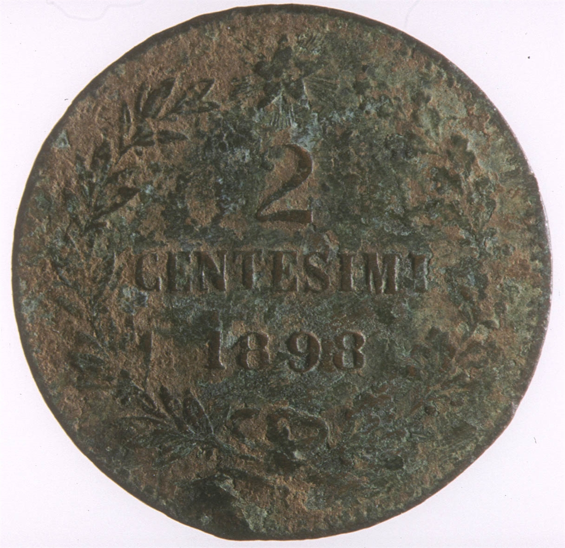 Revers: U sredini natpis u tri reda 2 / CENTESIMI / 1898. Oko natpisa dvije grančice (hrast i maslina) na vrhu zvijezda a na dnu oznaka kovnice R