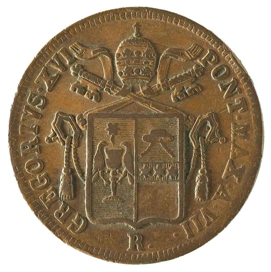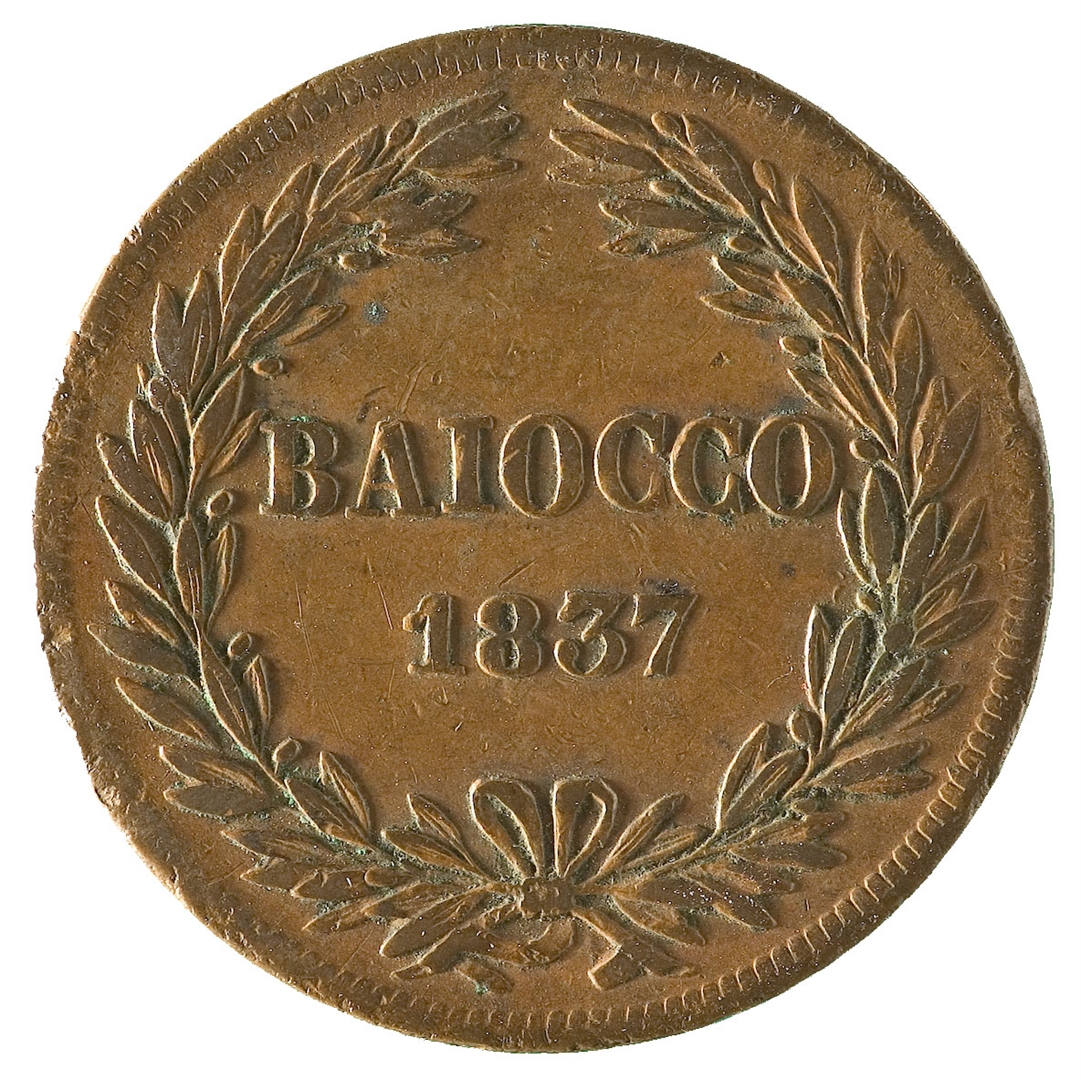 Avers: U sredini grb pape Grgura XVI. Oko ruba natpis: GREGORIVS • XVI - PONT • MAX • A • i godina pontifikata VII. U dnu slovo R oznaka kovnice. Revers: U sredini u dva reda natpis: BAIOCCO/1837. Oko ruba vijenac od lovorovog lišća.