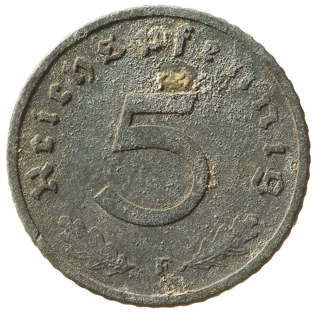 Revers: U sredini broj 5, a uz rub natpis Reichspfennig. Pri dnu između dva hrastova lista nalazi se oznaka kovnice F.
