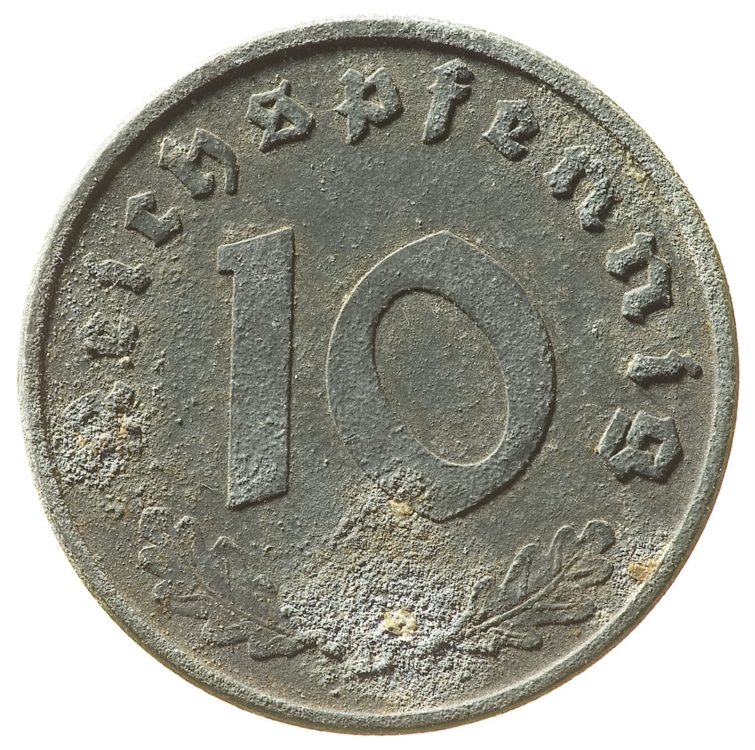 Revers: U sredini broj 10, a uz rub natpis Reichspfennig. Pri dnu između dva hrastova lista nalazi se oznaka kovnice D.