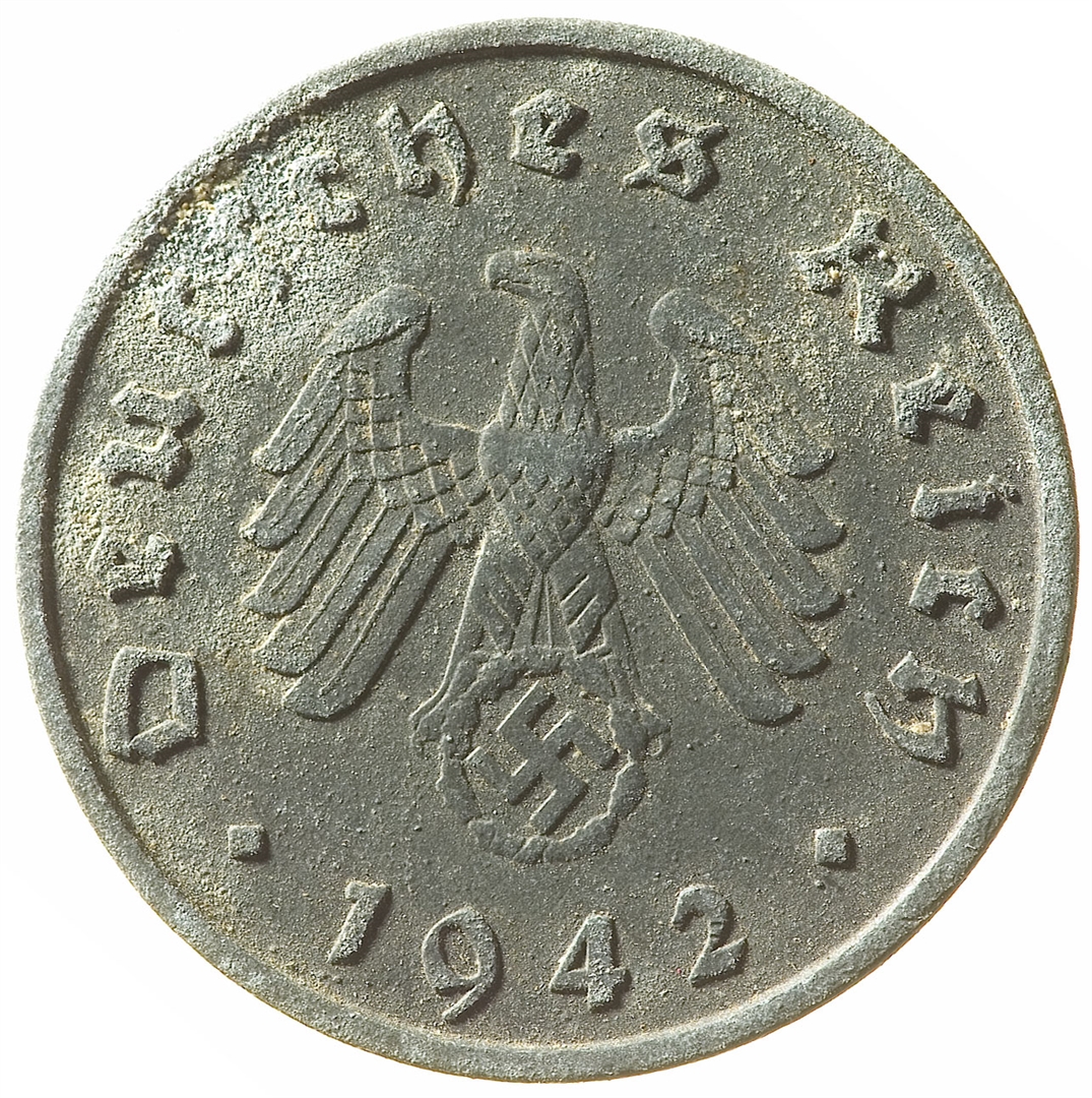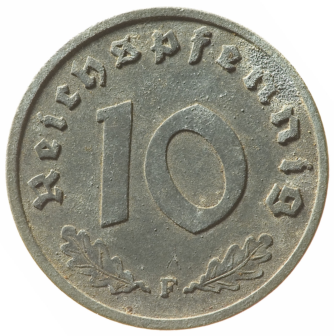 Avers: U sredini grb u obliku orla s raširenim krilima koji u kanđama drži kružni vijenac unutar kojeg se nalazi svastika. Oko ruba tekst Deutsches Reich a na dnu godina kovanja 1942. Revers: U sredini broj 10, a uz rub natpis Reichspfennig. Pri dnu između dva hrastova lista nalazi se oznaka kovnice F.