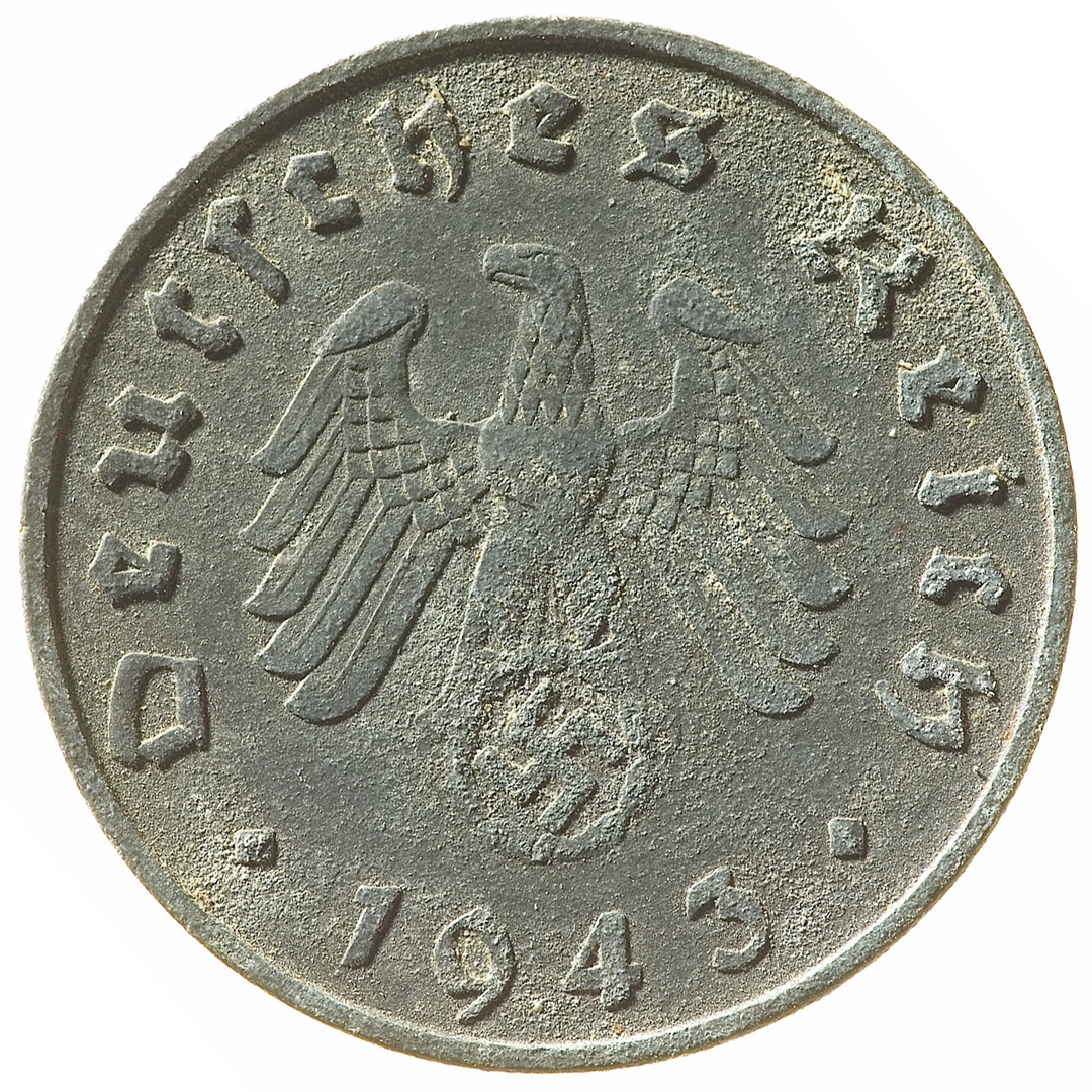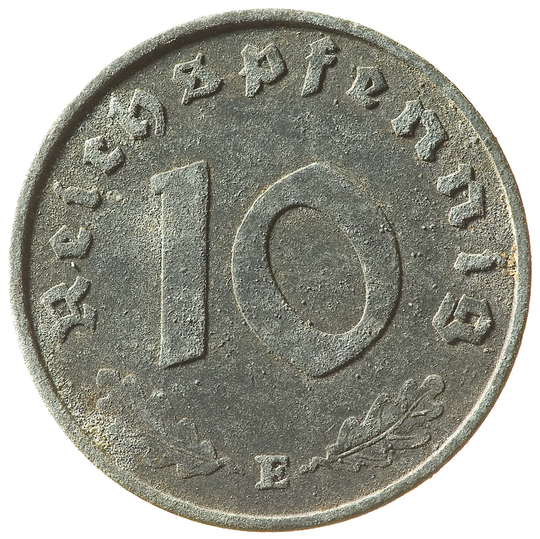 Avers: U sredini grb u obliku orla s raširenim krilima koji u kanđama drži kružni vijenac unutar kojeg se nalazi svastika. Oko ruba tekst Deutsches Reich a na dnu godina kovanja 1943. Revers: U sredini broj 10, a uz rub natpis Reichspfennig. Pri dnu između dva hrastova lista nalazi se oznaka kovnice E.