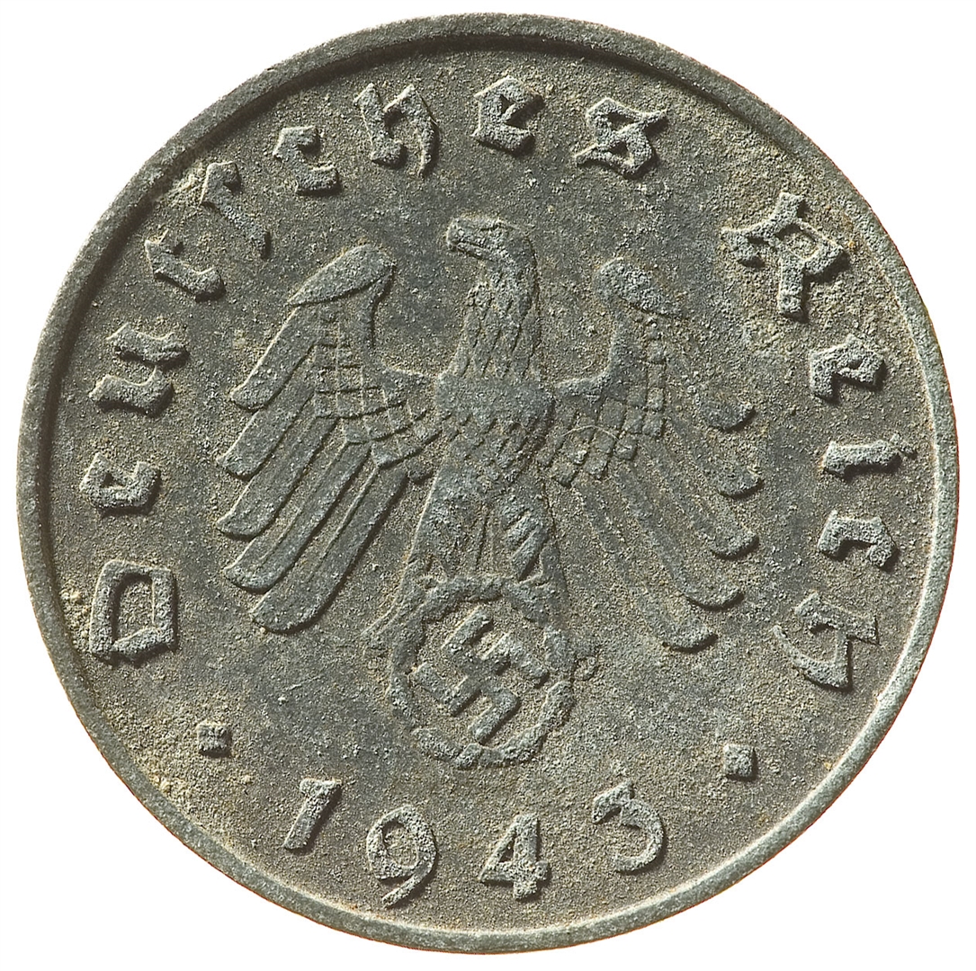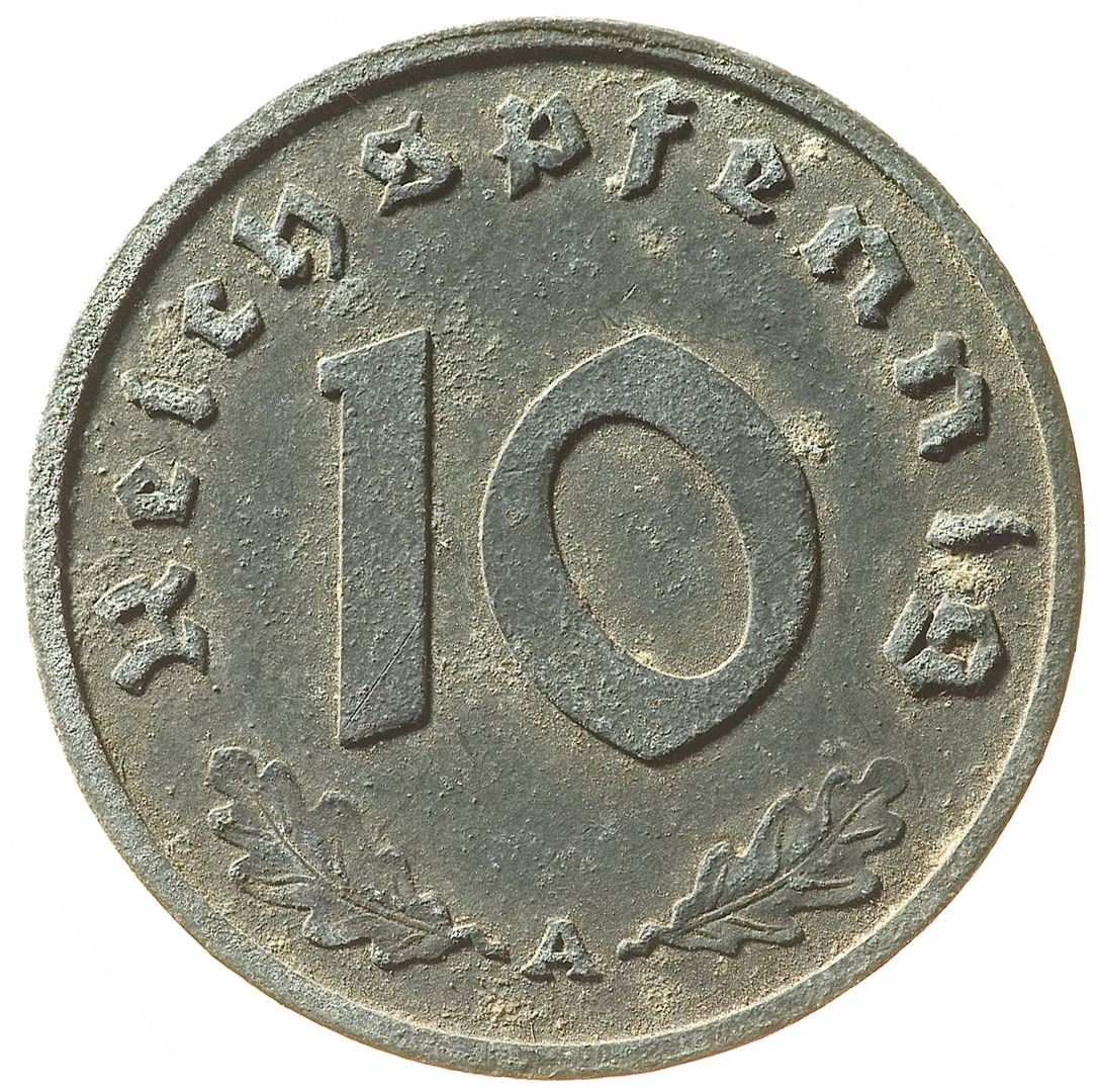 Avers: U sredini grb u obliku orla s raširenim krilima koji u kanđama drži kružni vijenac unutar kojeg se nalazi svastika. Oko ruba tekst Deutsches Reich a na dnu godina kovanja 1943. Revers: U sredini broj 10, a uz rub natpis Reichspfennig. Pri dnu između dva hrastova lista nalazi se oznaka kovnice A.