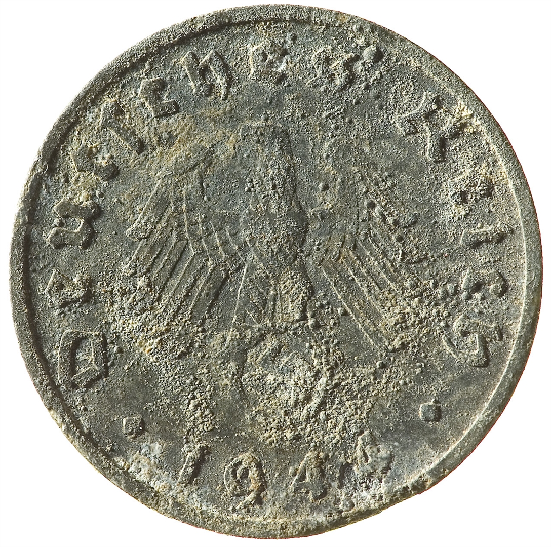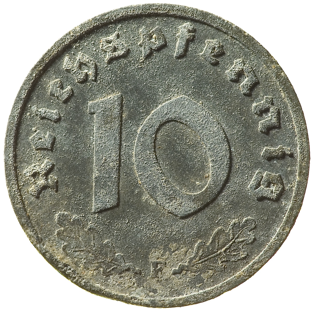 Avers: U sredini grb u obliku orla s raširenim krilima koji u kanđama drži kružni vijenac unutar kojeg se nalazi svastika. Oko ruba tekst Deutsches Reich a na dnu godina kovanja 1944. Revers: U sredini broj 10, a uz rub natpis Reichspfennig. Pri dnu između dva hrastova lista nalazi se oznaka kovnice F.