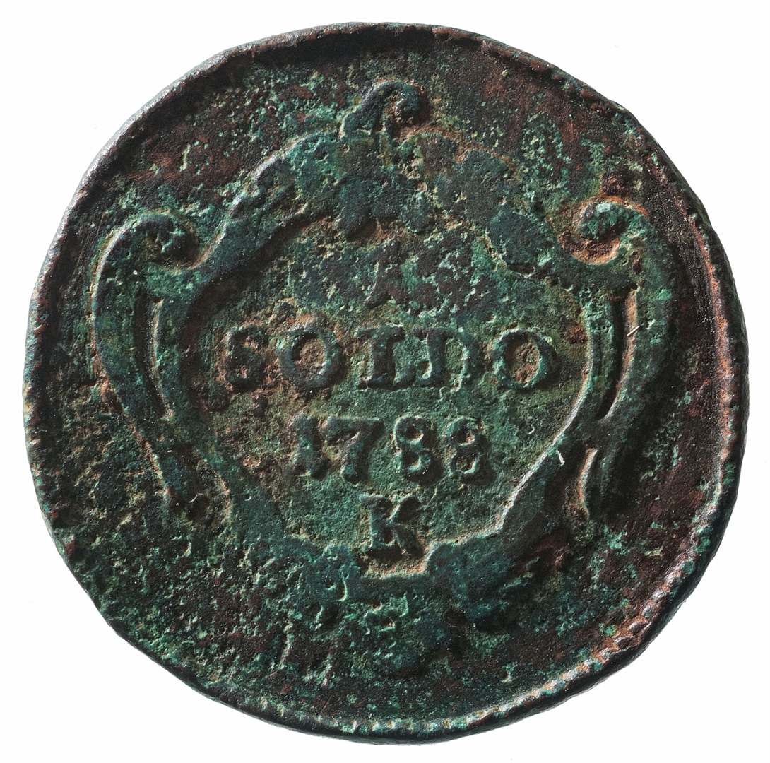 Avers: U sredini, unutar ukrašenog baroknog okvira iznad kojeg je kruna, nalazi se grb Gorice sa propetim lavom. Revers: U sredini unutar ukrašenog baroknog okvira nalazi se oznaka vrijednosti novca 1 Soldo. Ispod nje nalazi se godina 1788 i oznaka kovnice K.