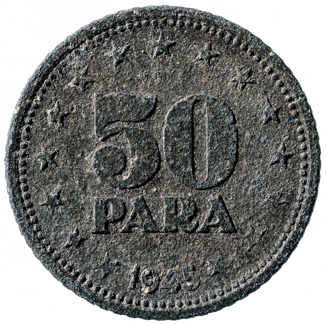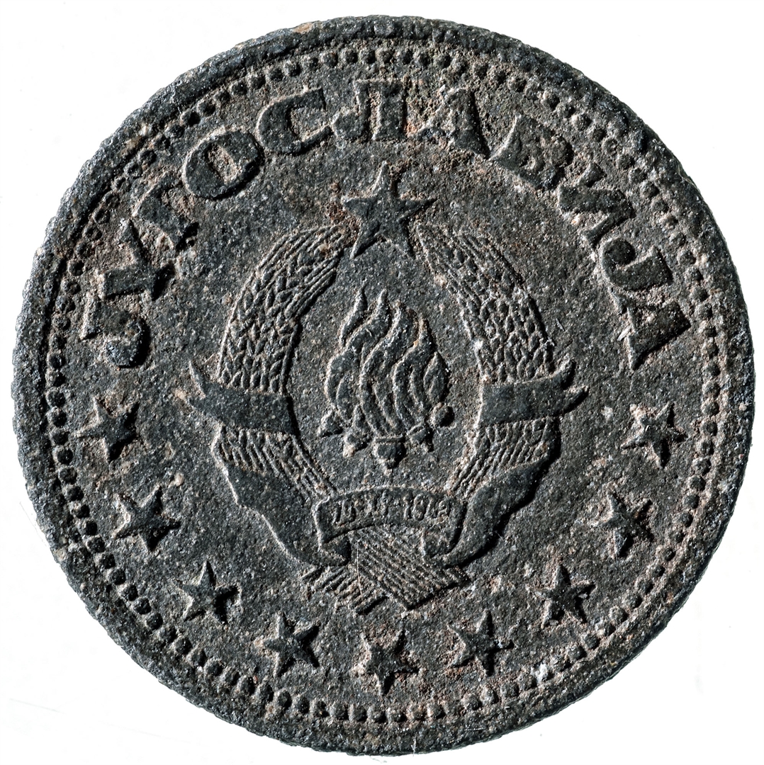 Avers: U sredini državni grb. U gornjem djelu uz rub polukružno napisan tekst JUGOSLAVIJA na ćirilici, a uz donji rub polukružno poredano 9 petokrakih zvjezdi. Revers: U sredini broj 50 (nominala), a ispod njega tekst PARA. Duž cijelog ruba polukružno poredano 15 petokrakih zvjezdi. Na dnu godina 1945.