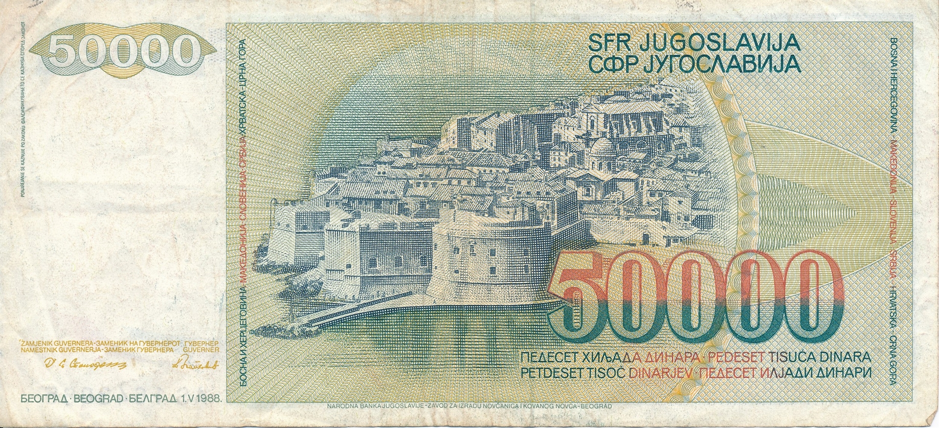 Avers: Na lijevoj strani nalazi se prikaz ženskog lika, a u središnjem djelu državni grb, nominala i serijski broj. Revers: Prikaz Dubrovnika, nominala i potpisi.
