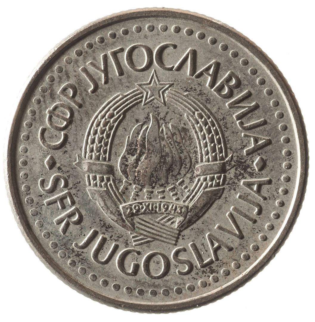 U sredini državni grb. Oko njega uz rub polukružno napisan tekst SFR JUGOSLAVIJA na latinici i ćirilici.