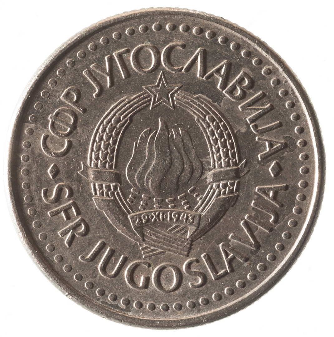 U sredini državni grb. Oko njega uz rub polukružno napisan tekst SFR JUGOSLAVIJA na latinici i ćirilici.