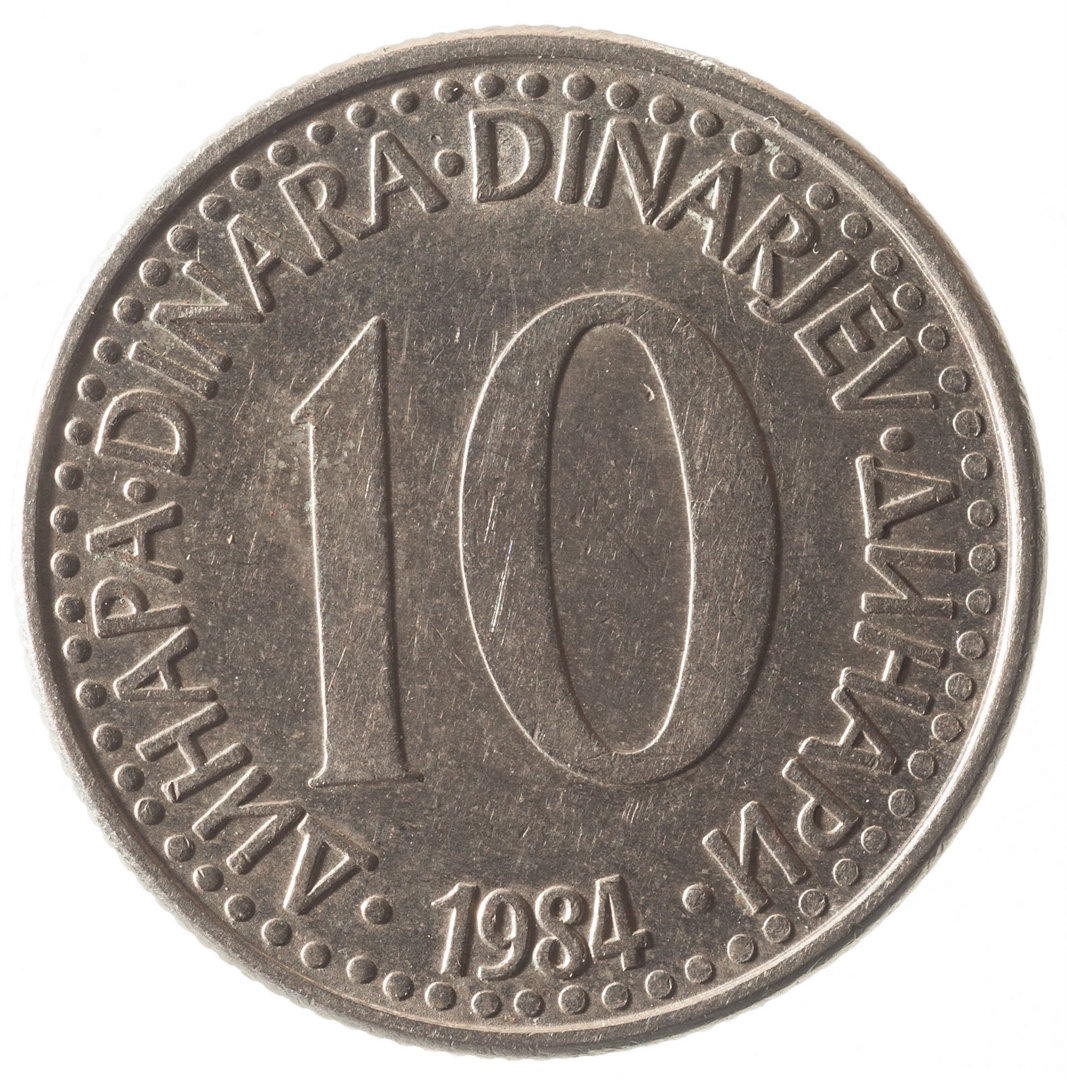 U sredini broj 10 (nominala), oko njega tekst DINAR na četiri jezika, a ispod toga godina 1984.
