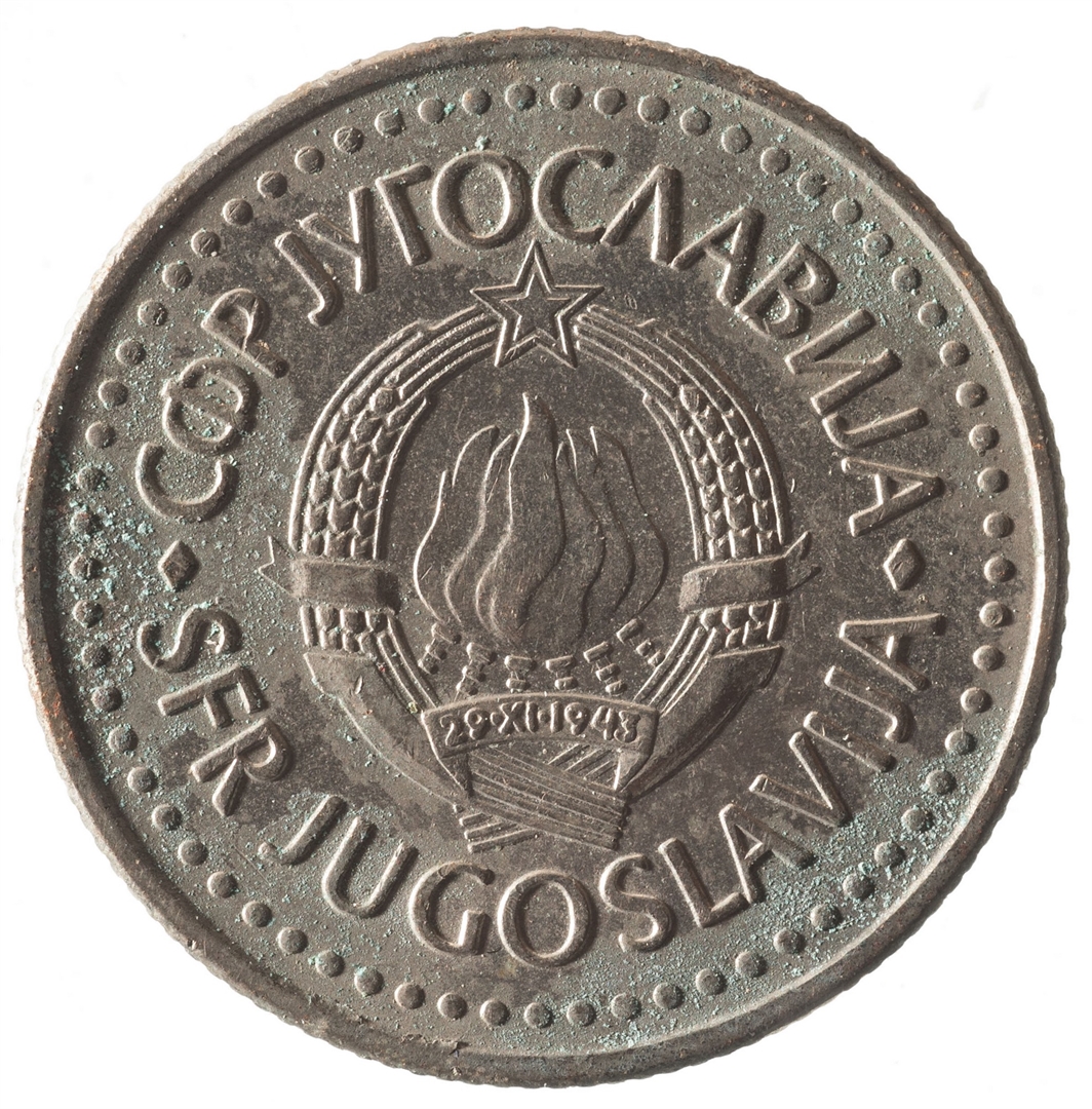 U sredini državni grb. Oko njega uz rub polukružno napisan tekst SFR JUGOSLAVIJA na latinici i ćirilici.