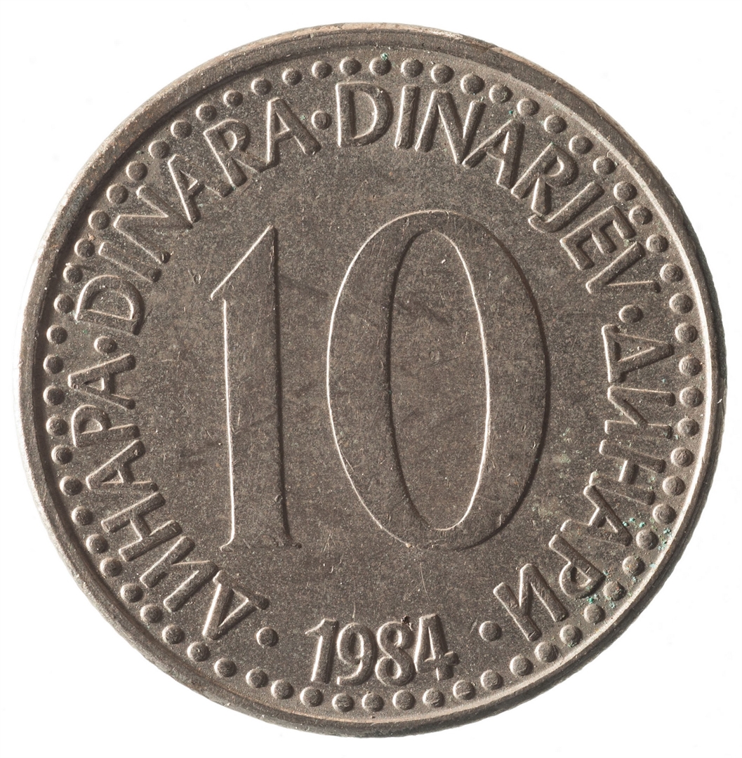U sredini broj 10 (nominala), oko njega tekst DINAR na četiri jezika, a ispod toga godina 1984.