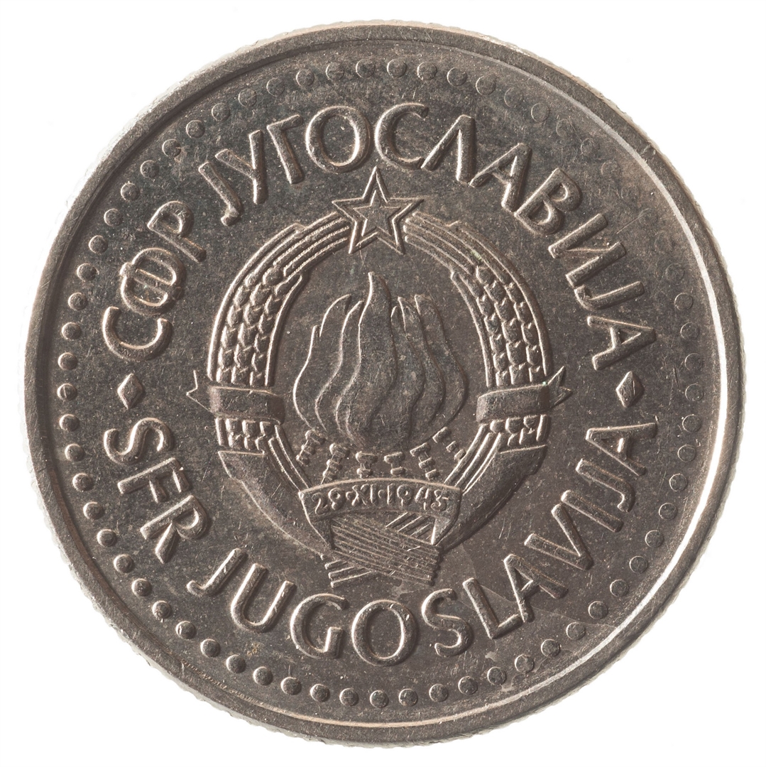 U sredini državni grb. Oko njega uz rub polukružno napisan tekst SFR JUGOSLAVIJA na latinici i ćirilici.