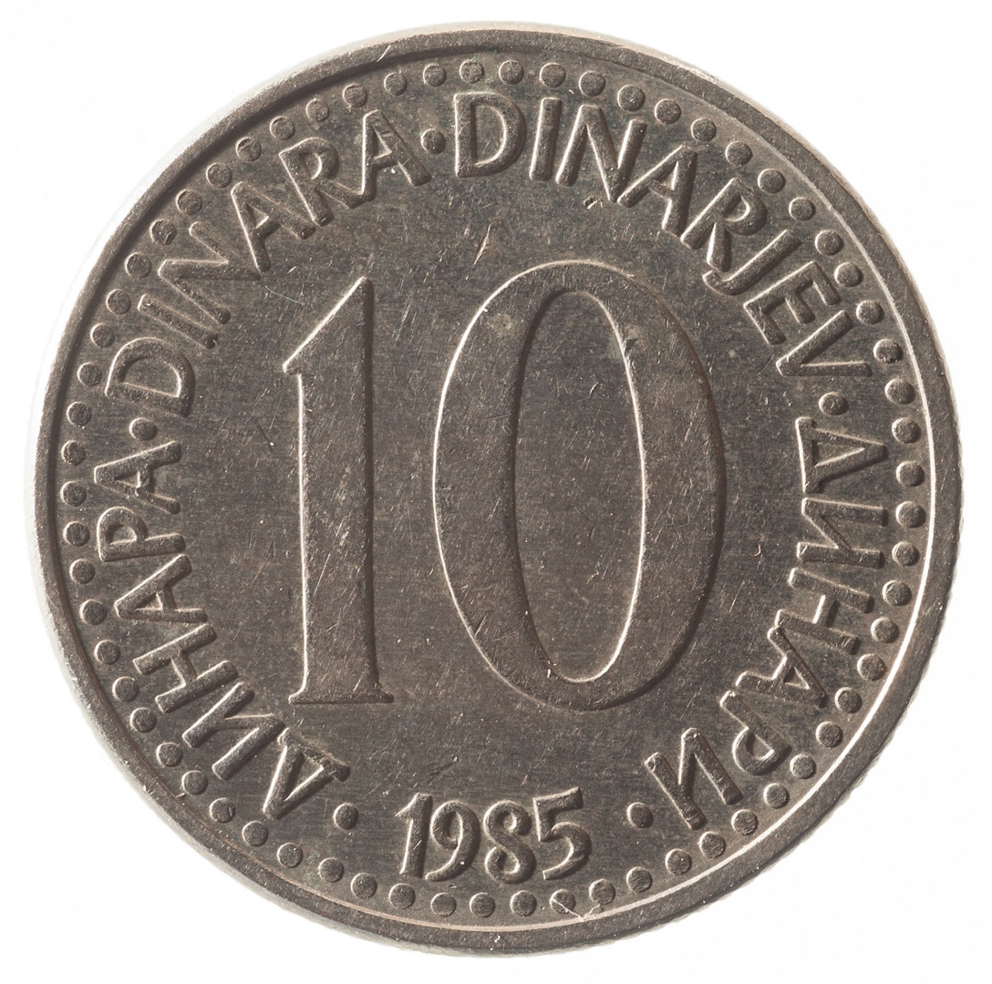 U sredini broj 10 (nominala), oko njega tekst DINAR na četiri jezika, a ispod toga godina 1985.