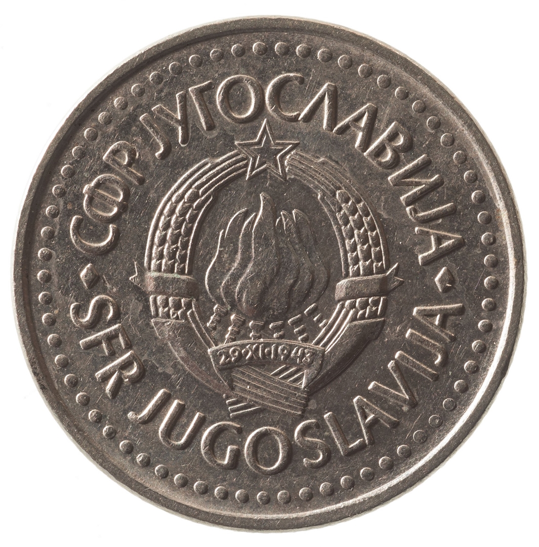 U sredini državni grb. Oko njega uz rub polukružno napisan tekst SFR JUGOSLAVIJA na latinici i ćirilici.