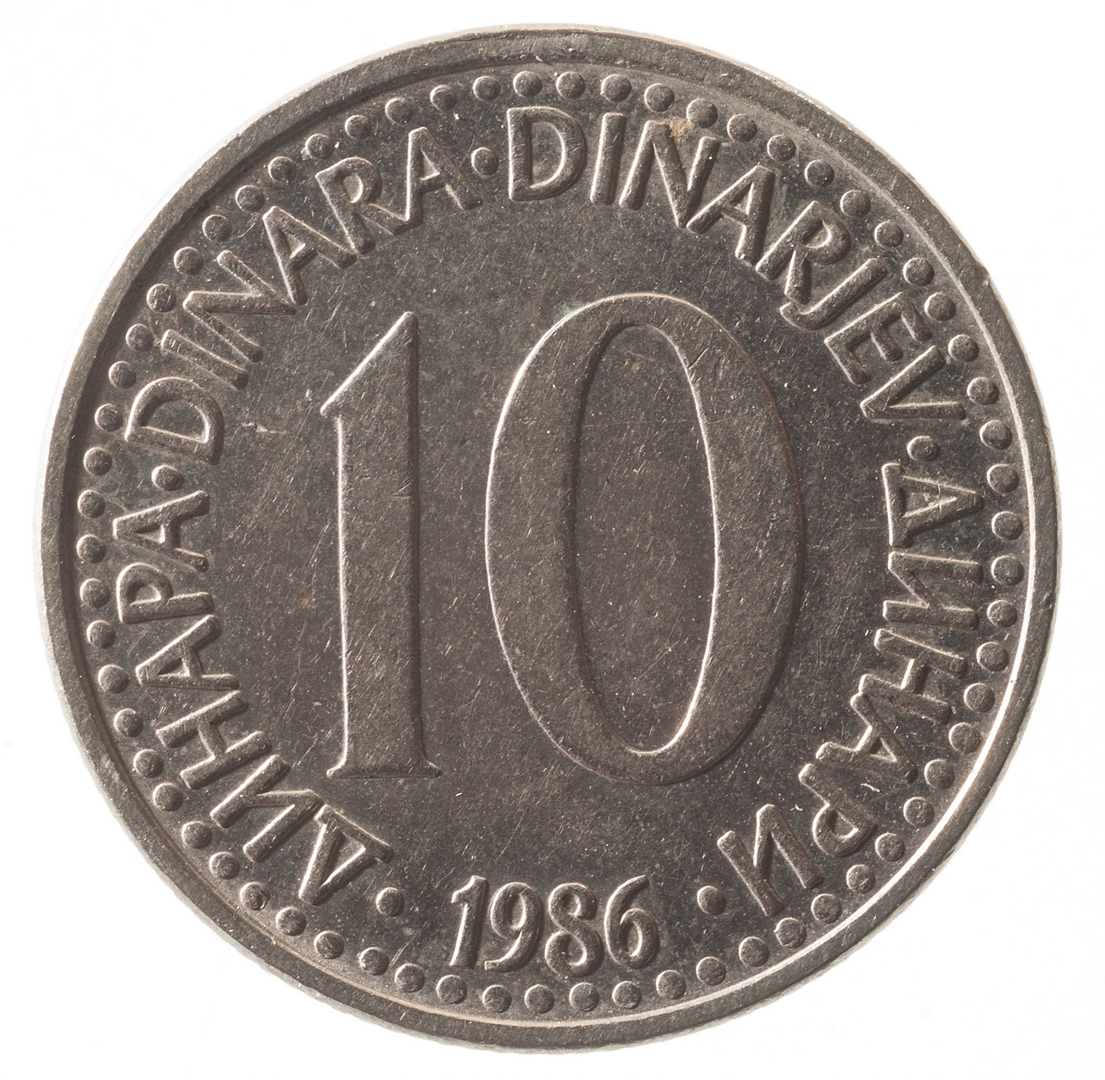 U sredini broj 10 (nominala), oko njega tekst DINAR na četiri jezika, a ispod toga godina 1986.