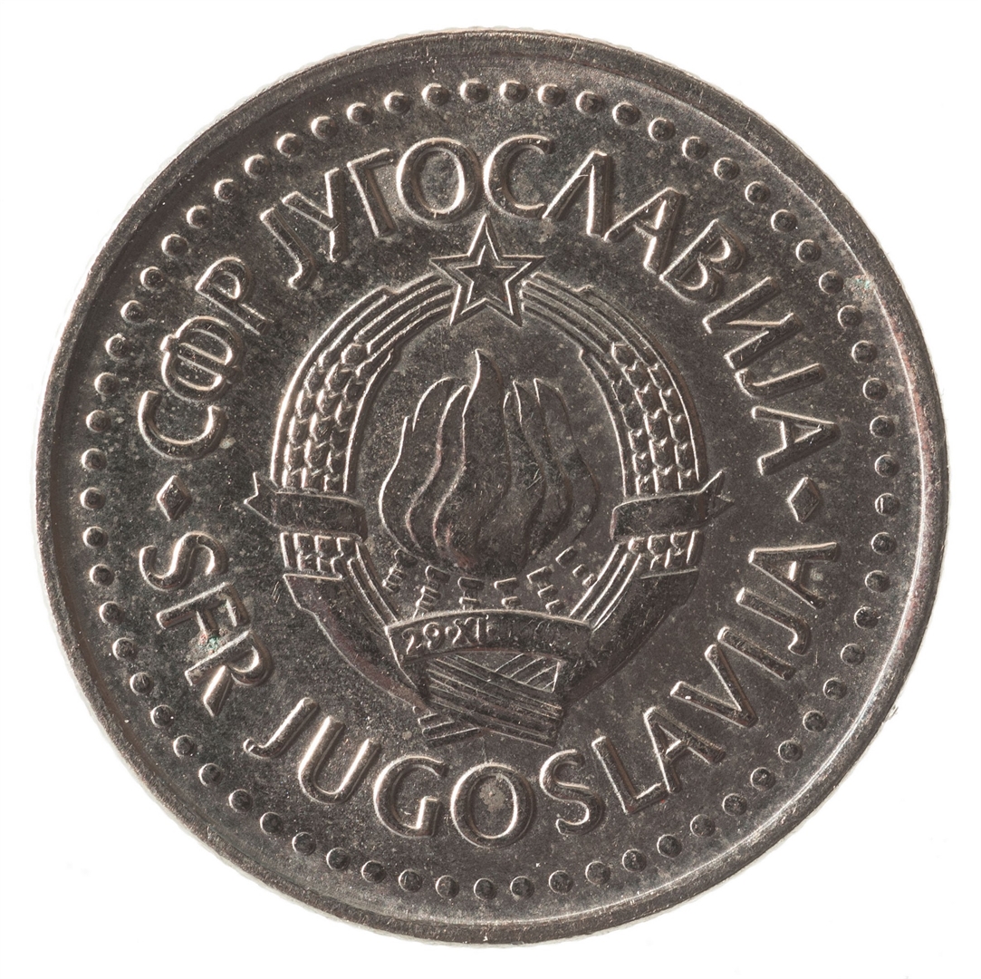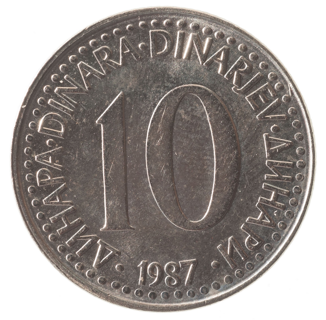 Avers: U sredini državni grb. Oko njega uz rub polukružno napisan tekst SFR JUGOSLAVIJA na latinici i ćirilici. Revers: U sredini broj 10 (nominala), oko njega tekst DINAR na četiri jezika, a ispod toga godina 1987.