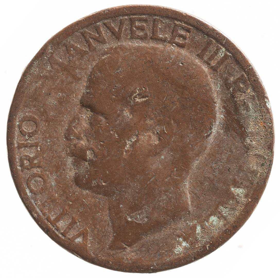 Centralni dio kovanice zauzima profil muške osobe sa pogledom u lijevo. Kružno uz rub kovanice proteže se natpis VITTORIO. EMANUELE. III. RE. D''ITALIA. Na dnu uz rub kovanice nalazi se natpis A. MOTTI.