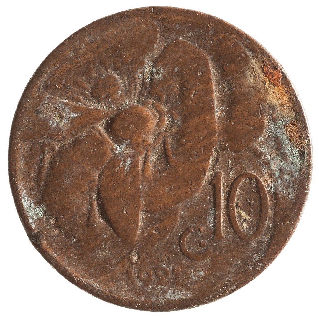Dvije trećine površine zauzima prikaz pčele na cvijetu. Uz desni doljnji rub kovanice nalazi se natpis c10, a uz lijevi donji rub veliko slovo R. Na samon dnu nalazi se godina 1921.