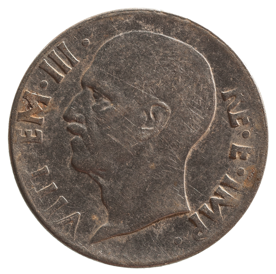 Centralni dio kovanice zauzima profil muške osobe sa pogledom u lijevo. Sa njegove lijeve strane nalazi se natpis VITT. EM.III, a sa njegove desne strane natpis RE.E.IMP.