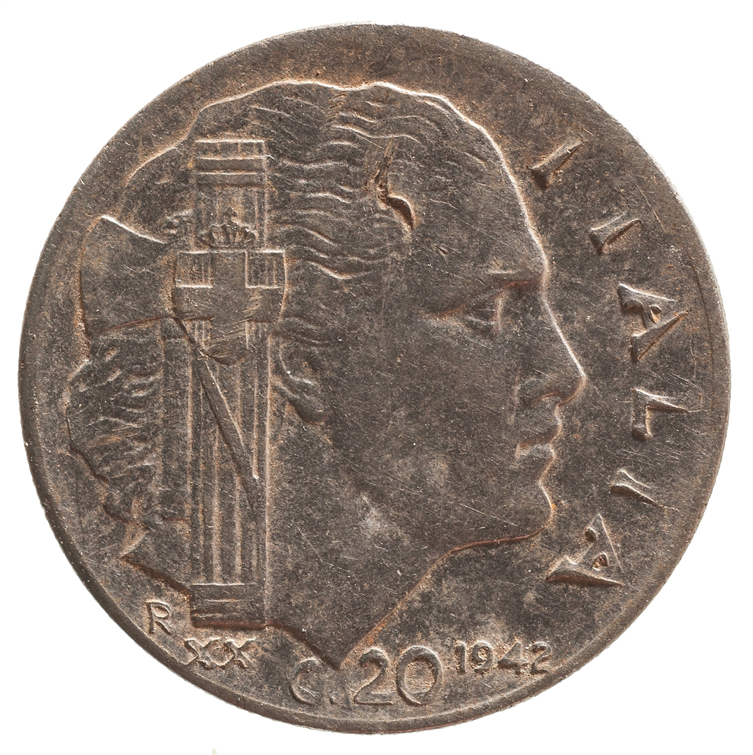Centralni dio kovanice zauzima profil ženske osobe sa pogledom u desno. Sa njezine lijeve strane nalazi se fascio, a ispod njega slovo R i rimski brojXX. Uz desni rub nalazi se natpis ITALIA, a na dnu C.20 i godina 1942.