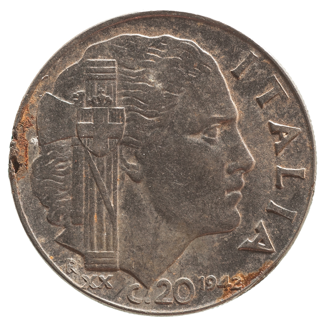 Avers: Centralni dio kovanice zauzima profil muške osobe sa pogledom u lijevo. Sa njegove lijeve strane nalazi se natpis VITT. EM.III, a sa njegove desne strane natpis RE.E.IMP. Na dnu uz rub nalazi se natpis G.ROMAGNOLI. Revers: Centralni dio kovanice zauzima profil ženske osobe sa pogledom u desno. Sa njezine lijeve strane nalazi se fascio, a ispod njega slovo R i rimski brojXX. Uz desni rub nalazi se natpis ITALIA, a na dnu C.20 i godina 1942.
