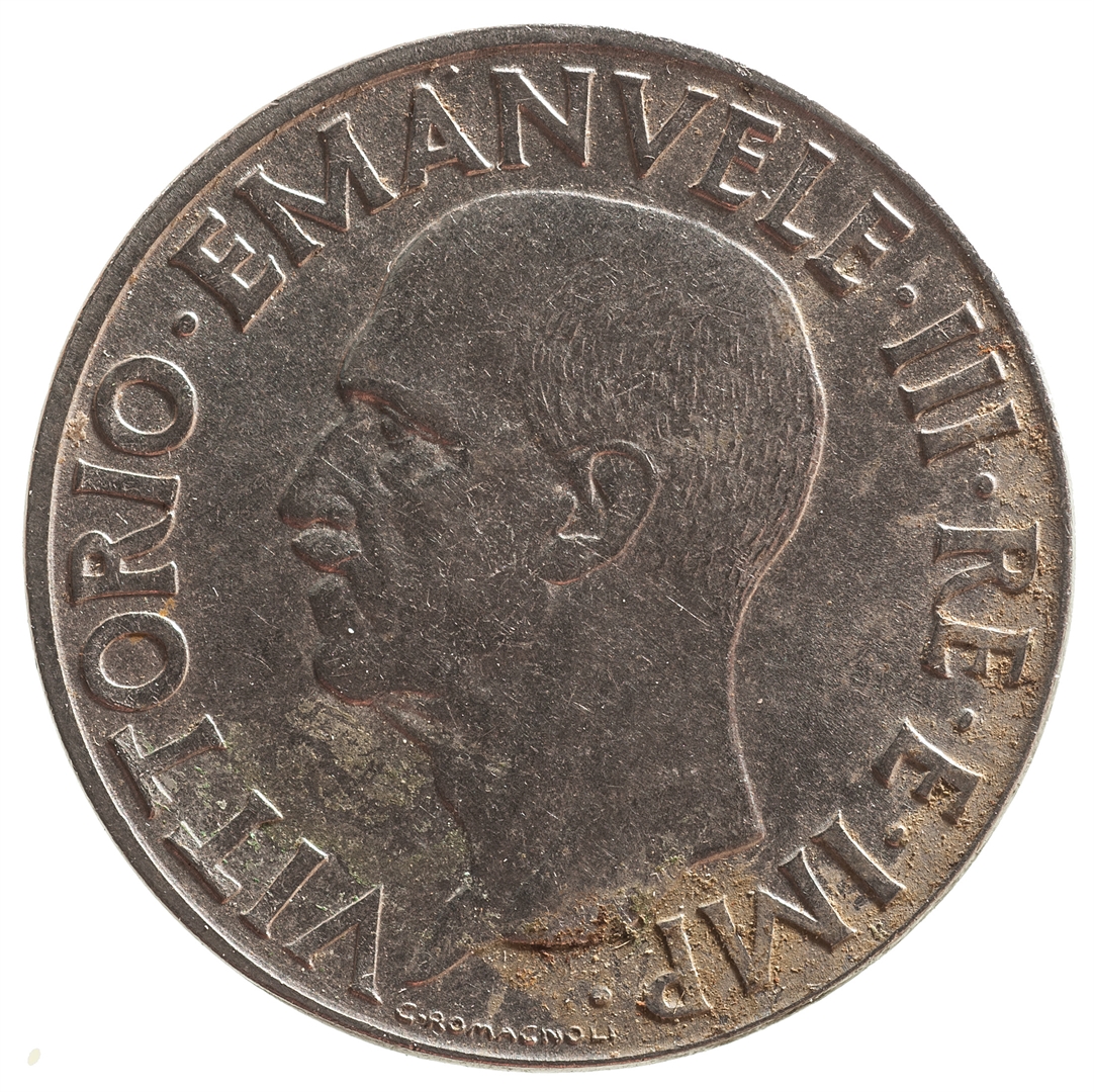 Centralni dio kovanice zauzima profil muške osobe sa pogledom u lijevo. Kružno uz rub kovanice proteže se natpis VITTORIO. EMANVELE. III. RE. E. IMP.. Na dnu uz rub nalazi se natpis G.ROMAGNOLI.