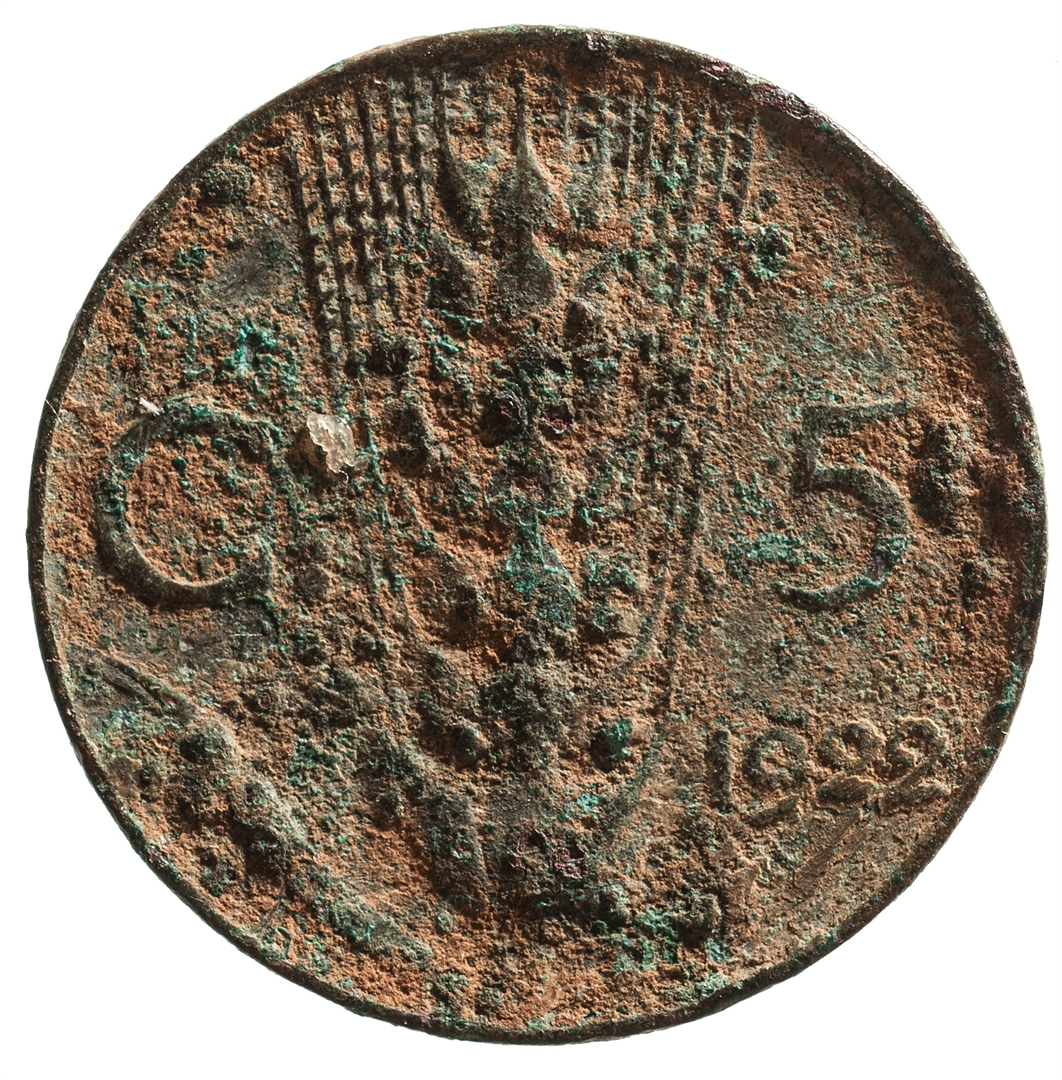 Centralni dio reversa zauzima klas pšenice sa čoje se lijeve strane nalazi slovoC, a sa desne broj 5. Ispod broja 5 godina 1929, a u samom dnu slovo R.