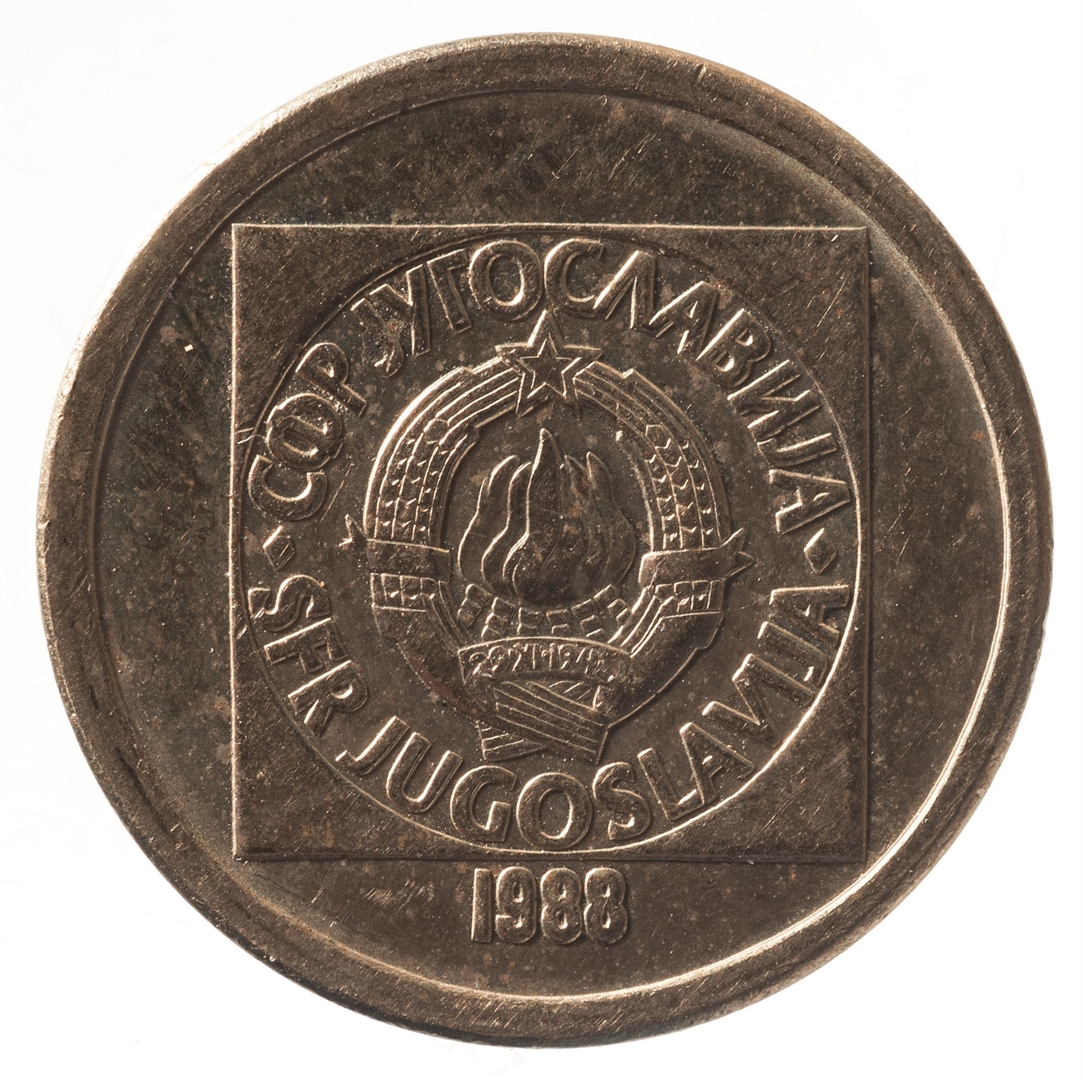 U sredini unutar četverokuta državni grb, a oko njega uz rub polukružno napisan tekst SFR JUGOSLAVIJA na latinici i ćirilici. Ispod godina 1988.